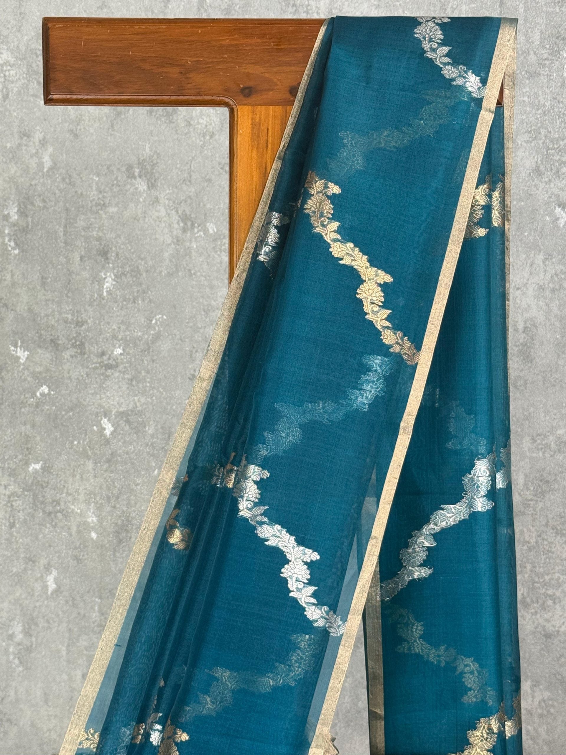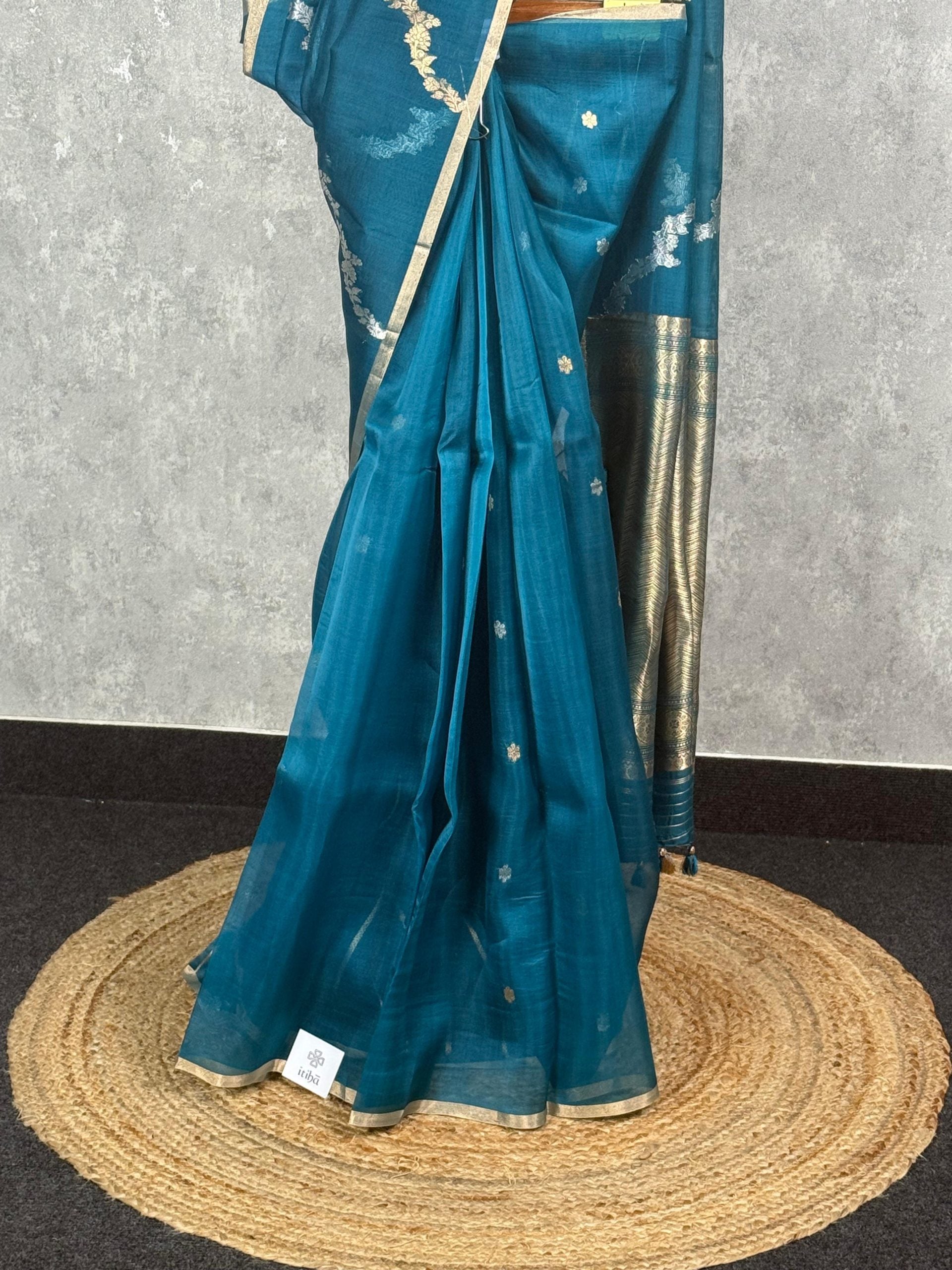 This graceful saree in a stunning teal blue hue exudes elegance and charm. Accentuated with delicate silver and golden zari motifs along with a beautifully woven border, it perfectly balances traditional artistry and modern allure. Ideal for festive celebrations or formal occasions, this saree adds a refined and regal touch to your ensemble.