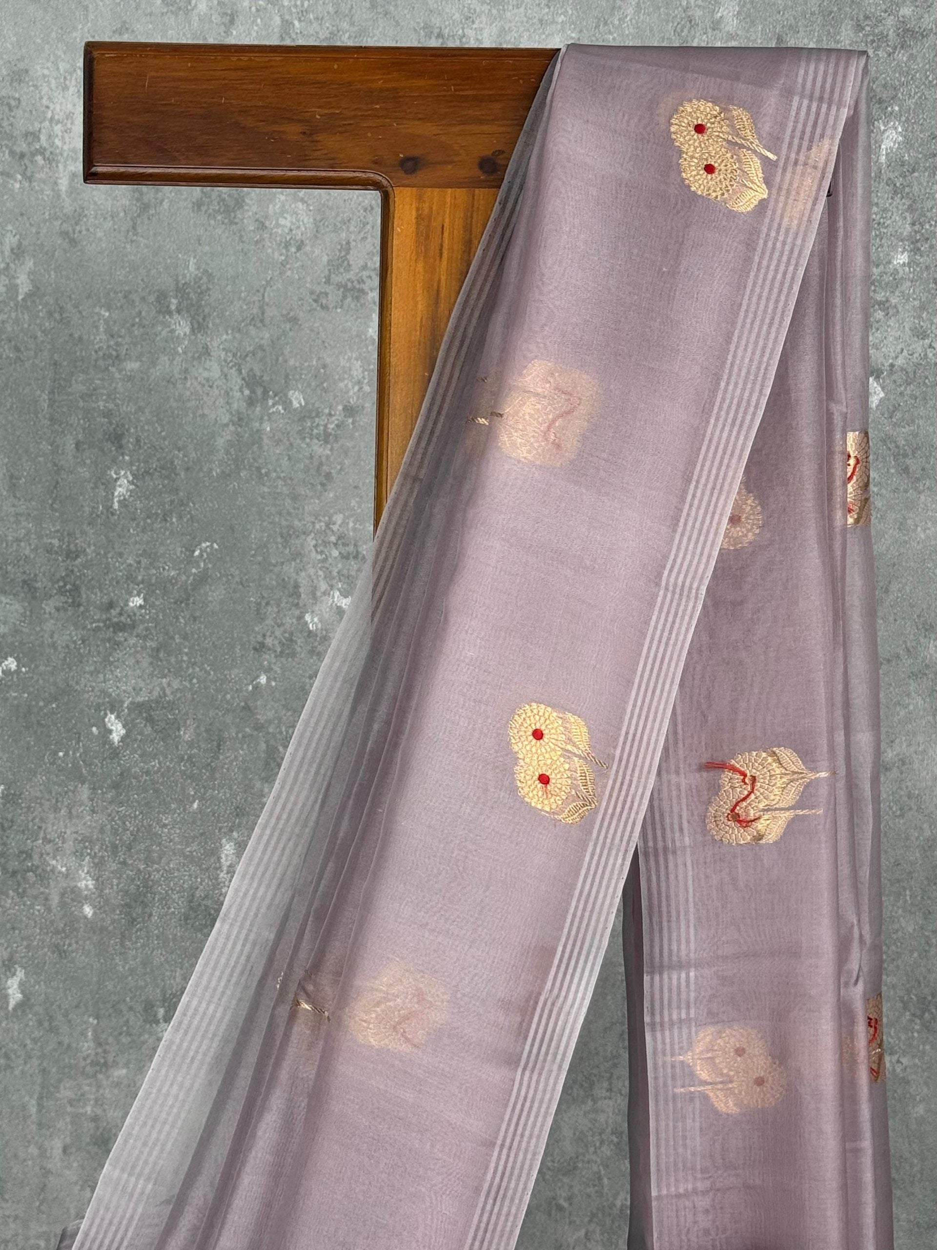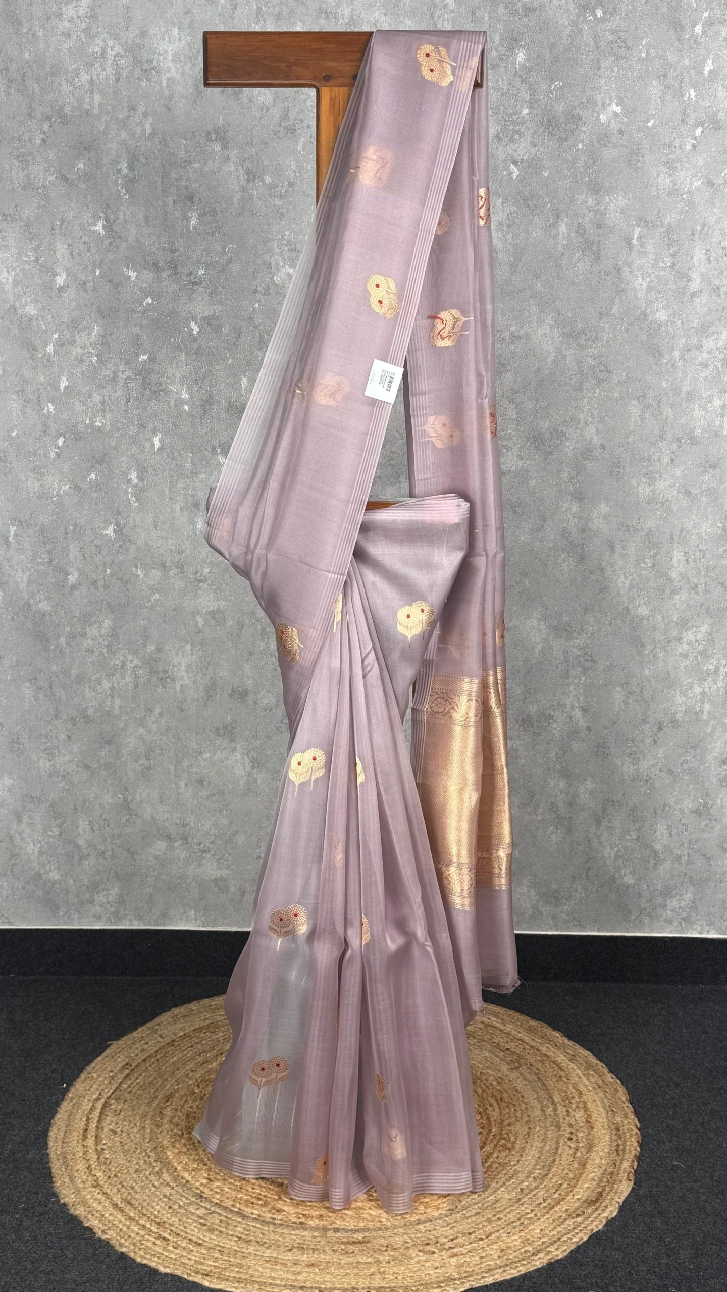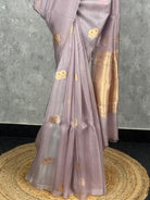 This elegant saree features a soft lavender-grey hue beautifully adorned with delicate golden zari motifs. Its subtle sheen and refined weaving lend an aura of understated luxury and charm. Perfect for festive gatherings or sophisticated occasions, it offers a graceful and timeless appeal.