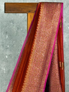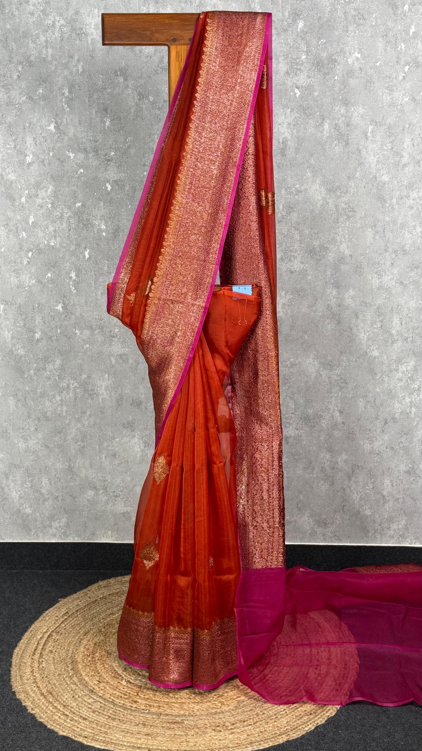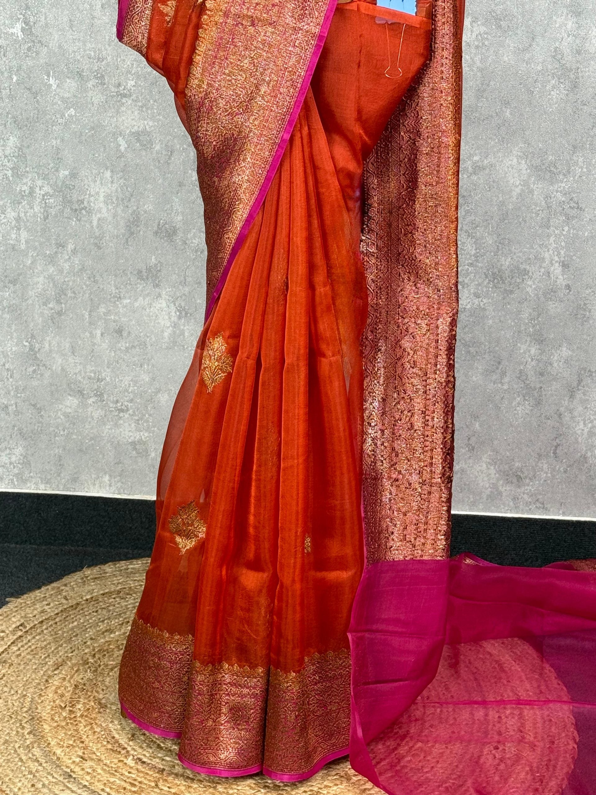 This saree exudes festive charm with its rich orange base beautifully complemented by an intricate rose-gold zari border. The contrasting magenta pallu adds a vibrant pop of color, enhancing the overall elegance of the drape. Perfect for weddings and grand celebrations, it combines tradition with a touch of contemporary flair.