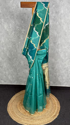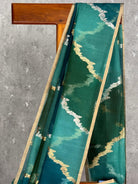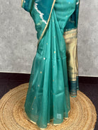 This saree features a refreshing teal green base paired with a beautifully designed pallu showcasing artistic waves in gold and silver detailing. The subtle zari accents and soft sheen add a graceful elegance to the drape. Perfect for festive occasions and daytime celebrations, it blends modern charm with traditional sophistication.