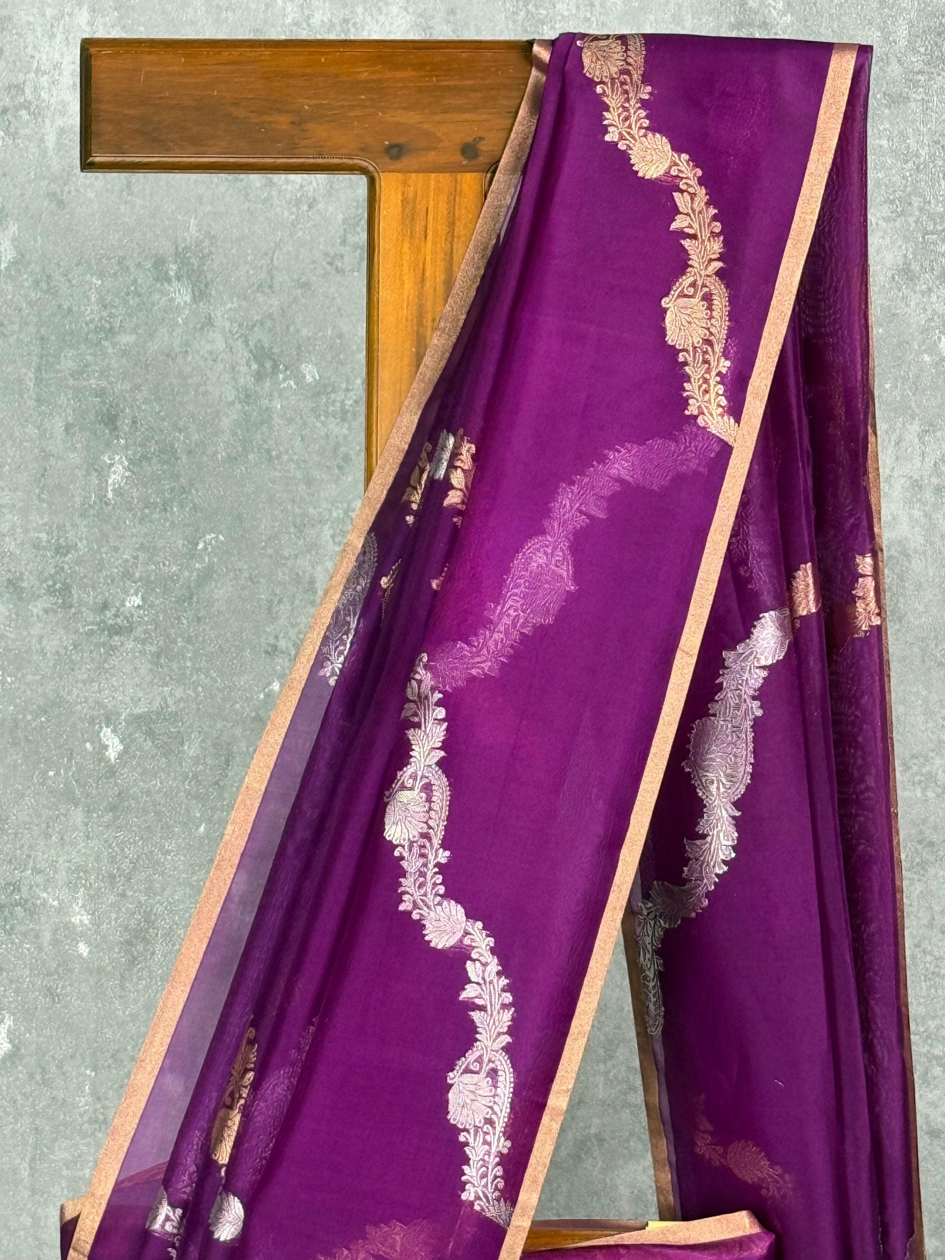 This saree stands out with its rich purple hue, beautifully accented by shimmering gold and silver woven motifs. The gracefully patterned pallu and subtle buttas across the body add a refined traditional charm. Perfect for festive occasions, weddings, and celebrations, it offers a regal and elegant look.