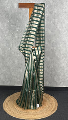 This elegant saree showcases a stunning combination of deep green and metallic gold stripes, creating a perfect balance of sophistication and modern flair. The lustrous fabric enhances its graceful drape, making it ideal for festive celebrations and special occasions. Its contemporary striped design adds a touch of uniqueness to traditional charm.
