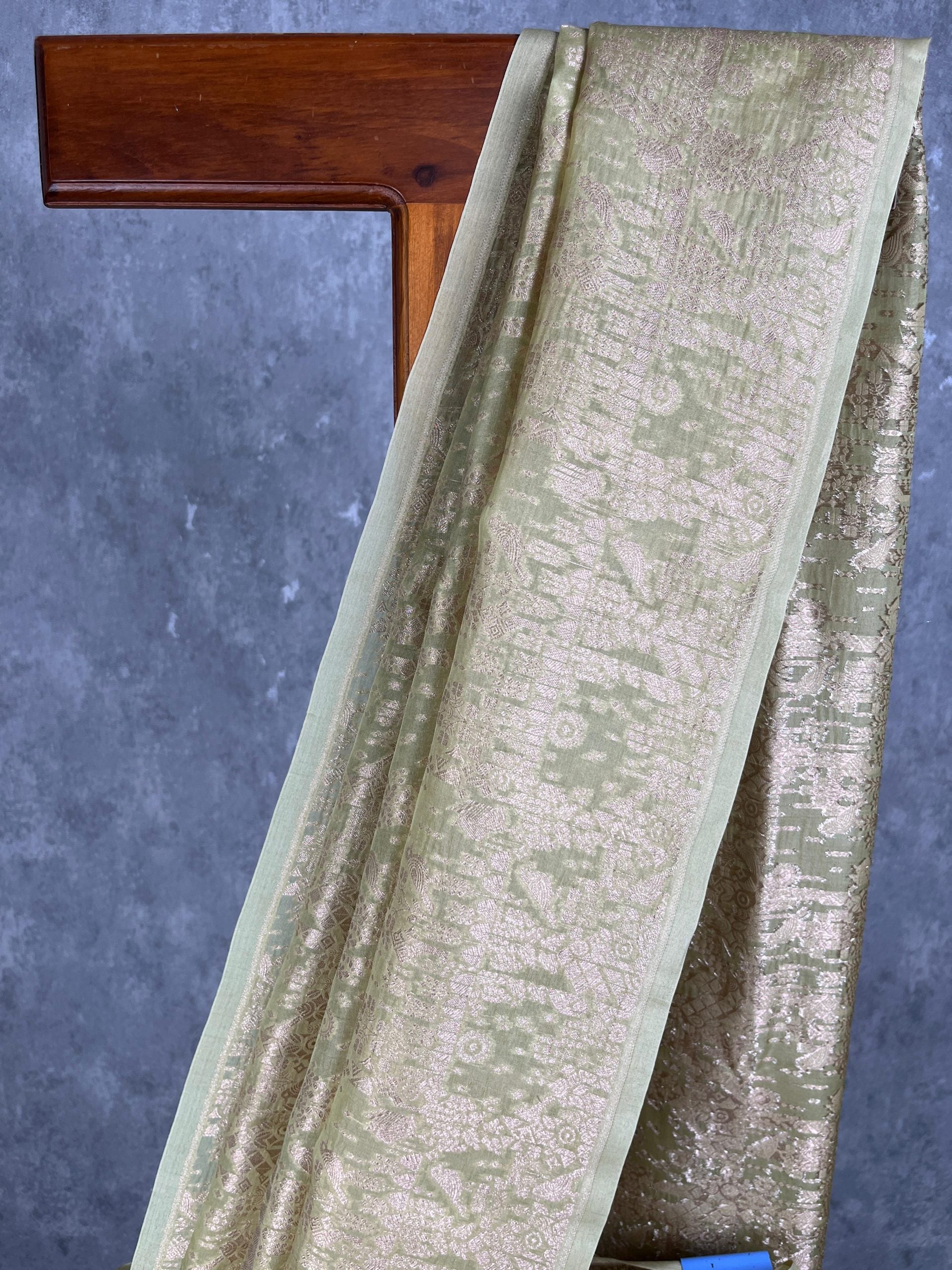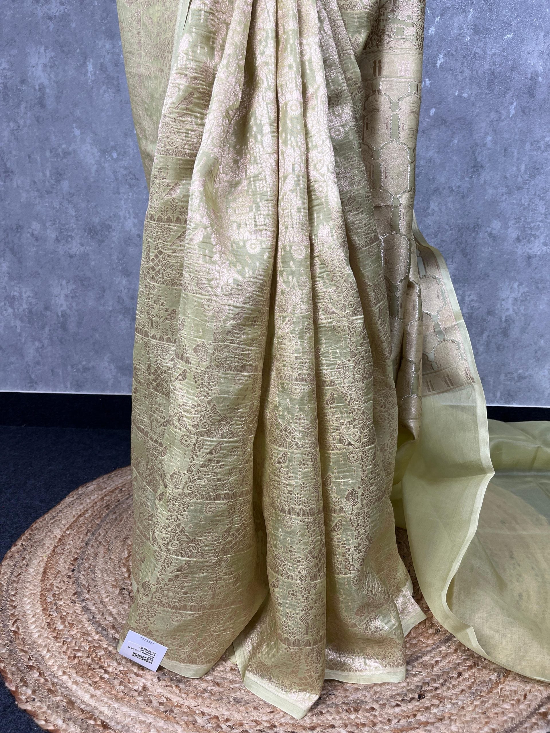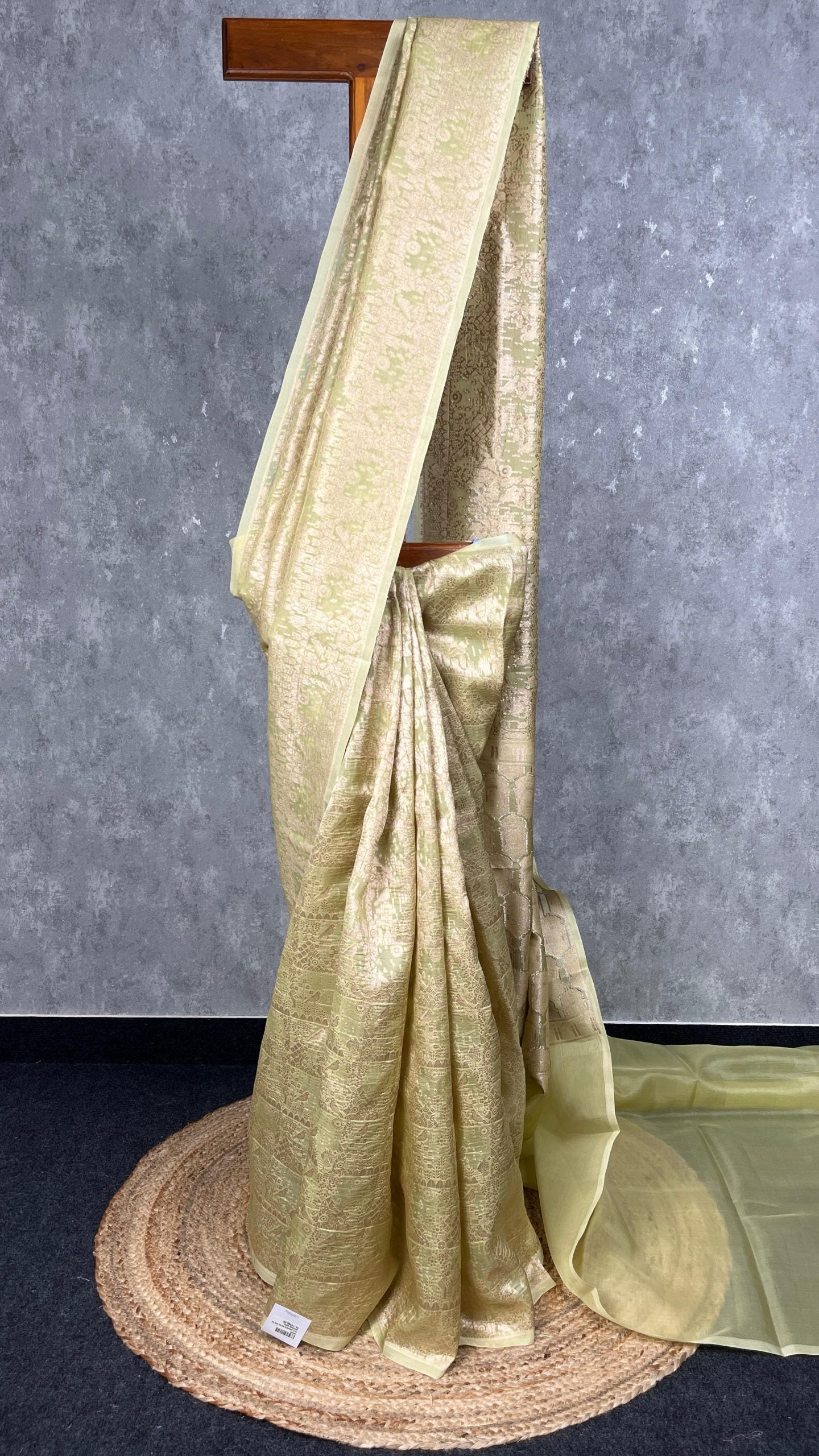 Pure silk organza banarasi saree with light gold brocade weave all over the body. The saree is woven in borderless concept and has attached self color organza blouse piece with zari border along the sleeve edges.
