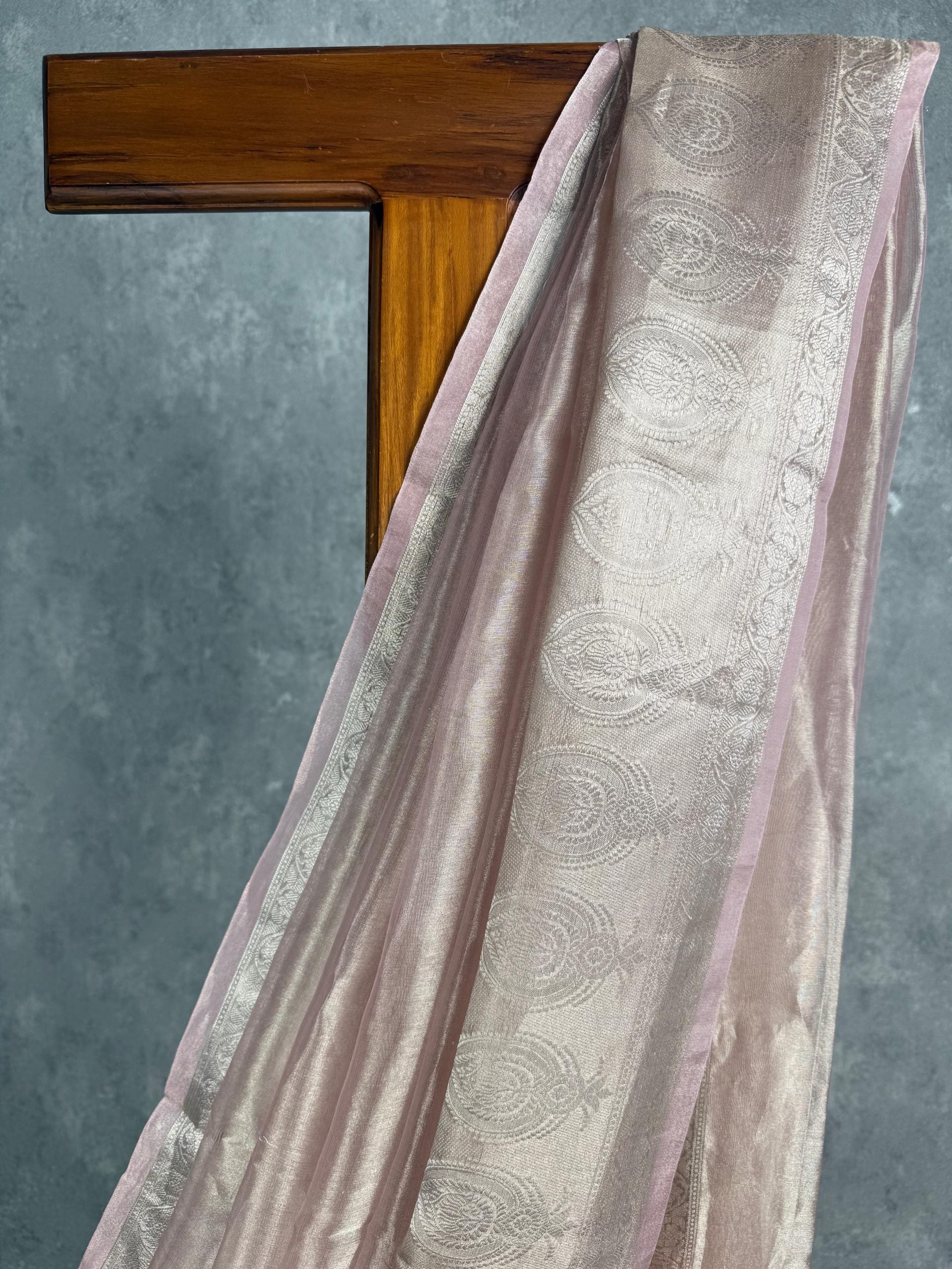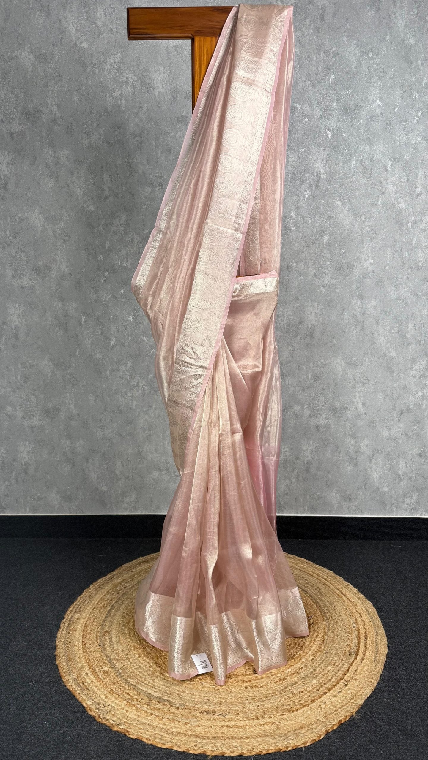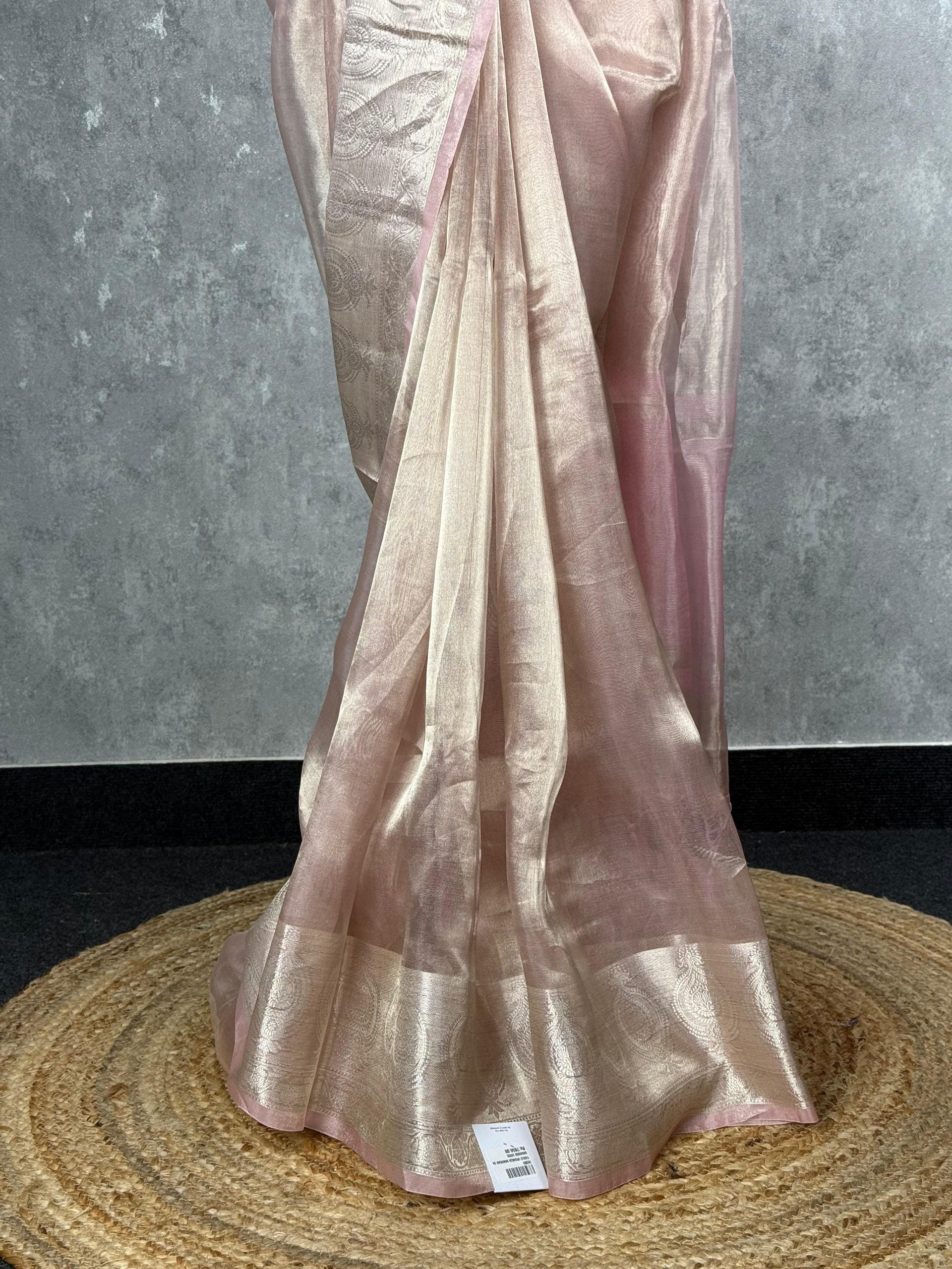 This Tissue Organza Banarasi Saree features a soft blush pink hue with a luminous sheen that adds grace and charm. The saree is adorned with subtle Banarasi weaving and a matching tissue border, offering a perfect blend of tradition and elegance. The saree comes with attached self coloured blouse piece.