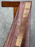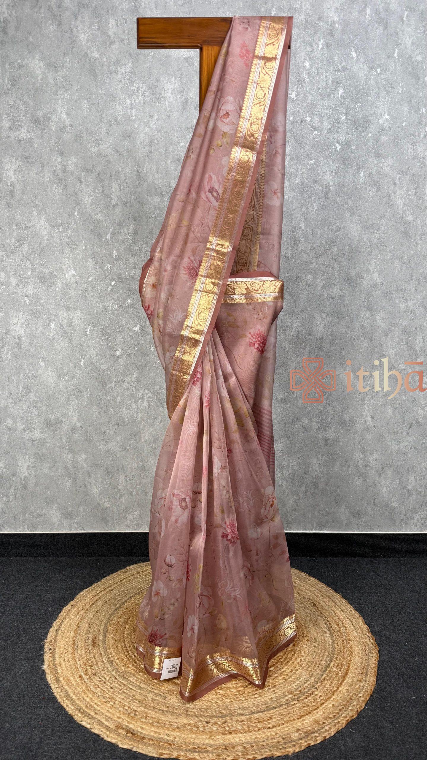 This Silk Organza Printed Saree features a delicate mauve base adorned with subtle floral prints in pastel shades. The saree is enhanced with a soft sheen and complemented by a woven zari border in a gold tone. The saree comes with attached blouse piece.