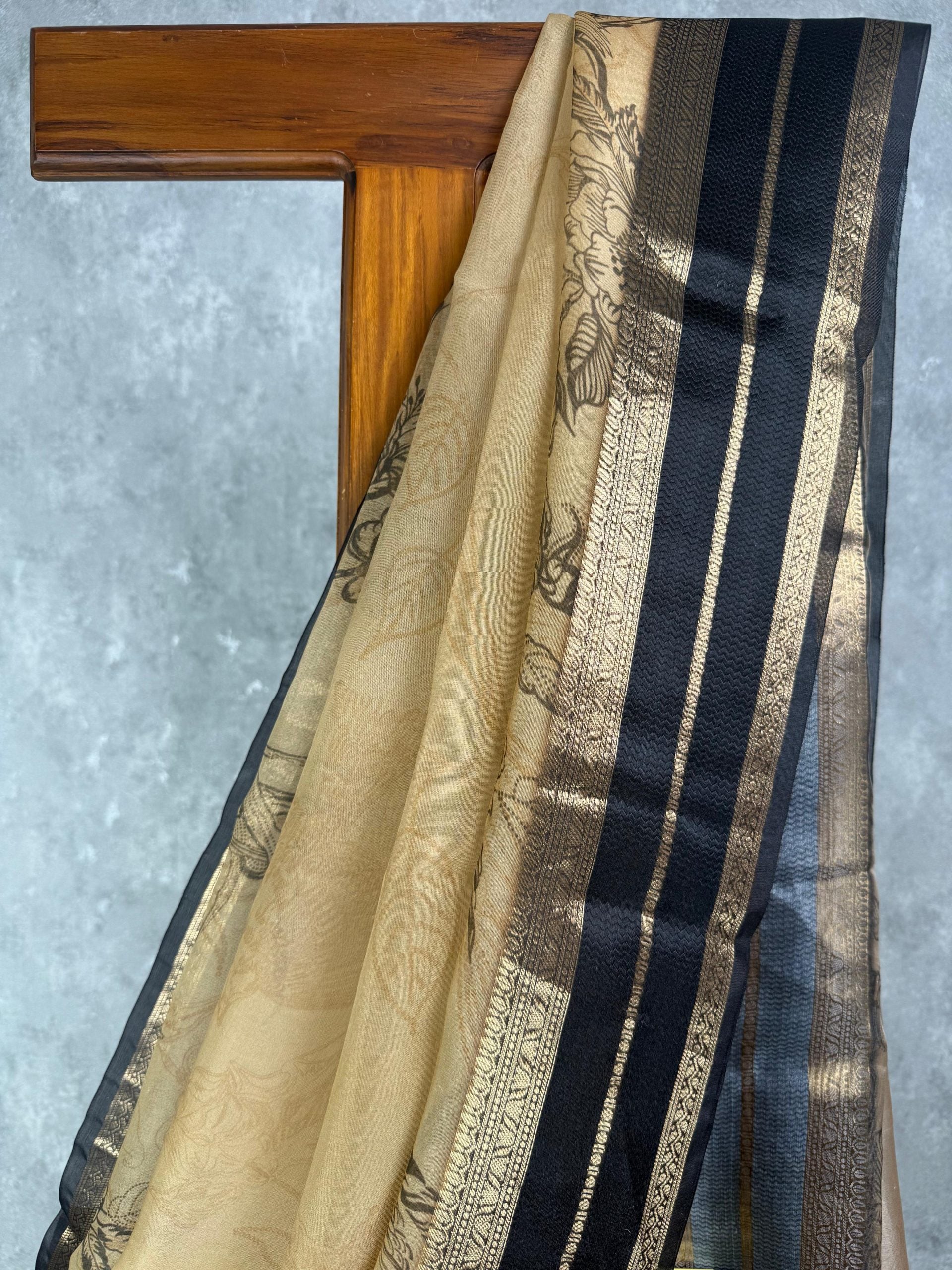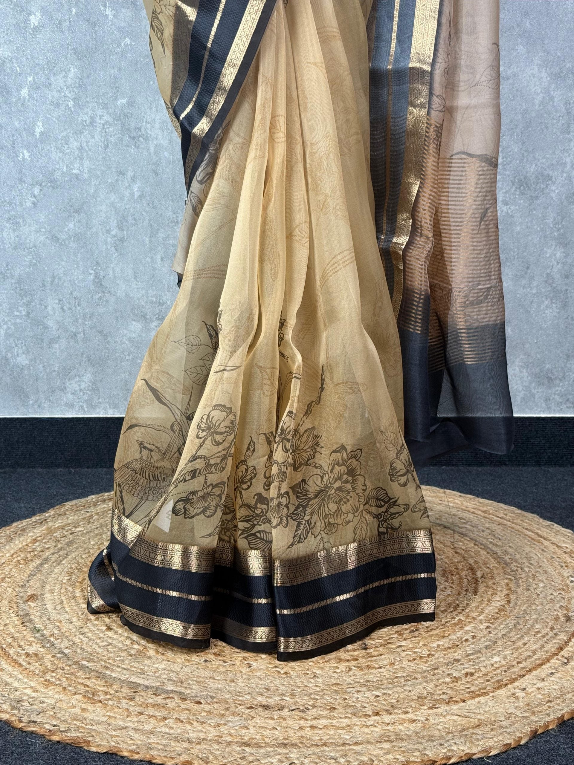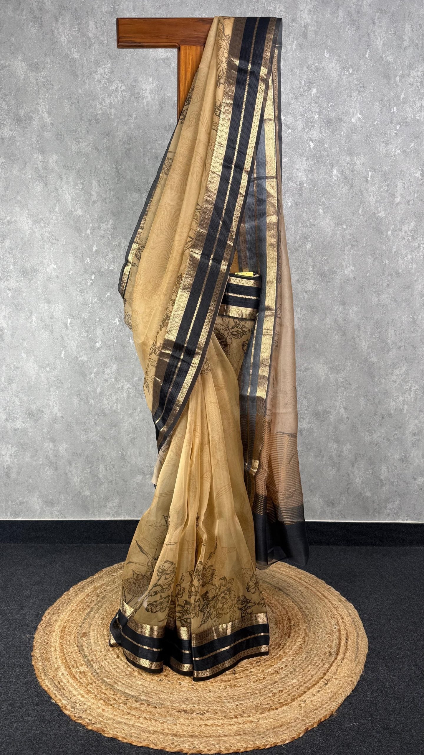 This Silk Organza Printed Saree features a soft beige base with elegant floral print detailing near the border. The saree is beautifully complemented by a rich black and gold zari woven border and pallu, adding a striking contrast.The saree comes with attached blouse piece.