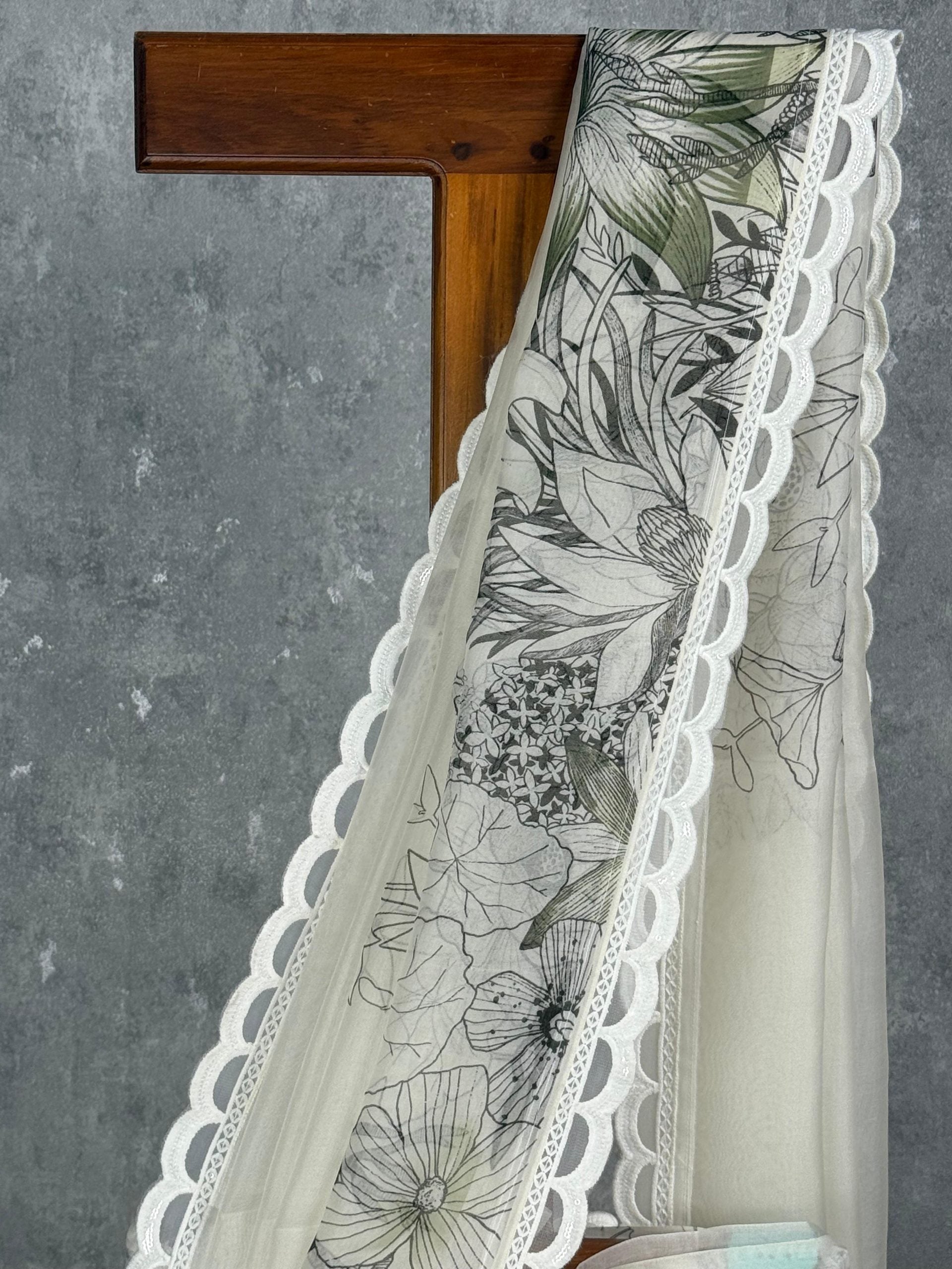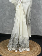 This elegant off-white saree radiates understated beauty with its delicate black floral prints and graceful lace border. The subtle combination of simplicity and intricate detailing makes it a perfect choice for daytime events or elegant gatherings. Its lightweight fabric enhances comfort while maintaining a refined, timeless appeal