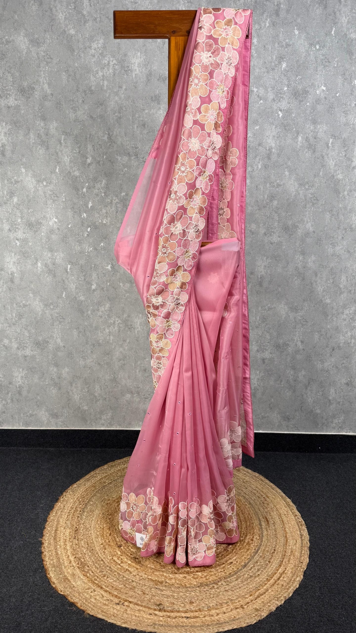 This organza embroidery saree is a vibrant pink hue with intricate floral patterns embroidered along the border. The delicate embroidery features a combination of pink and cream-colored flowers, adding a touch of elegance to the overall design. The saree’s lightweight organza fabric drapes elegantly, creating a flowing silhouette. The floral embroidery is meticulously crafted, showcasing a beautiful blend of traditional craftsmanship and modern style.The saree comes with attached blouse piece.