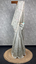 Semi organza saree featuring beautiful cross-stitch embroidery.The grey shade is adorable with small floral patterns. The saree comes with attached blouse piece.