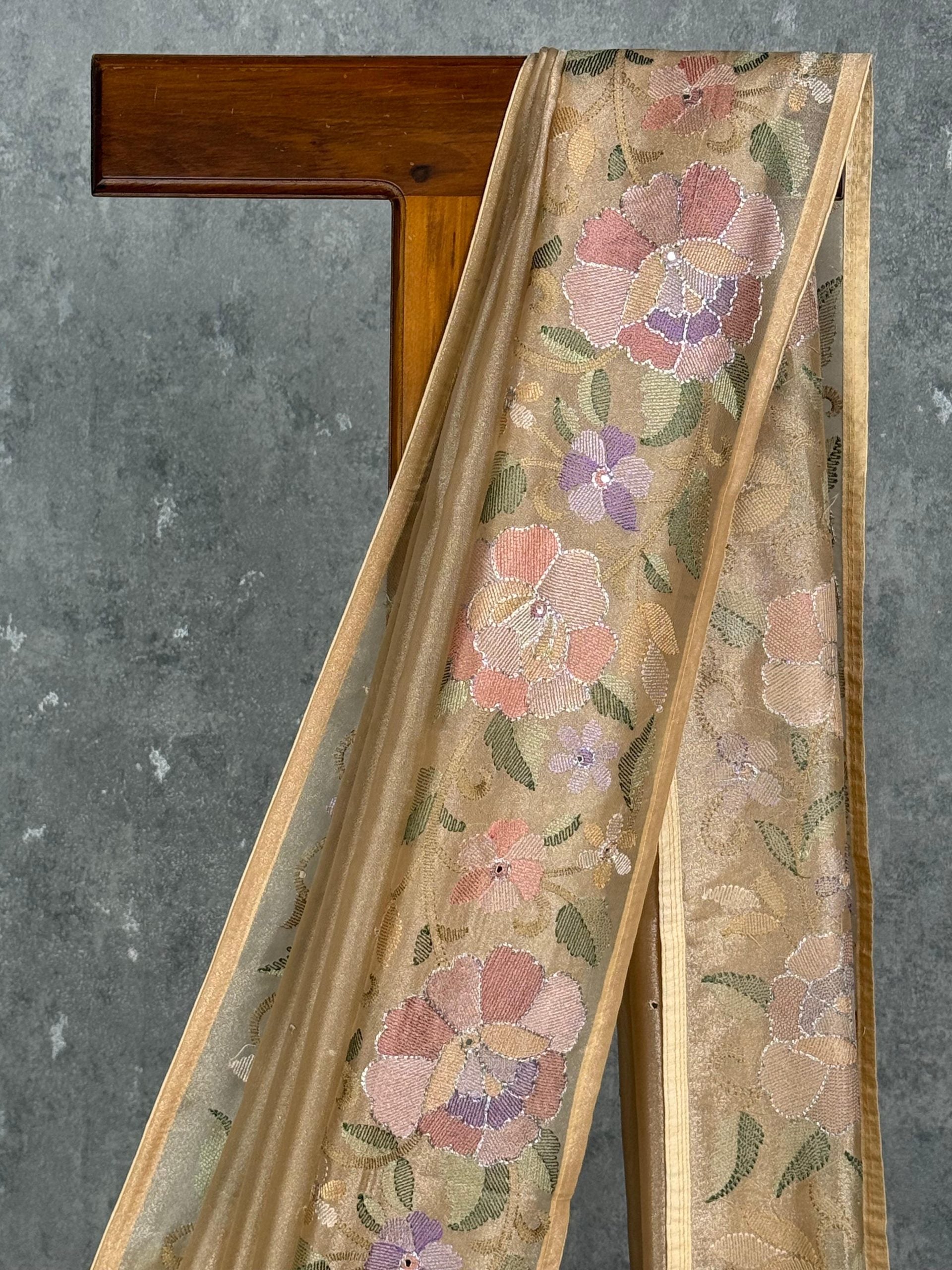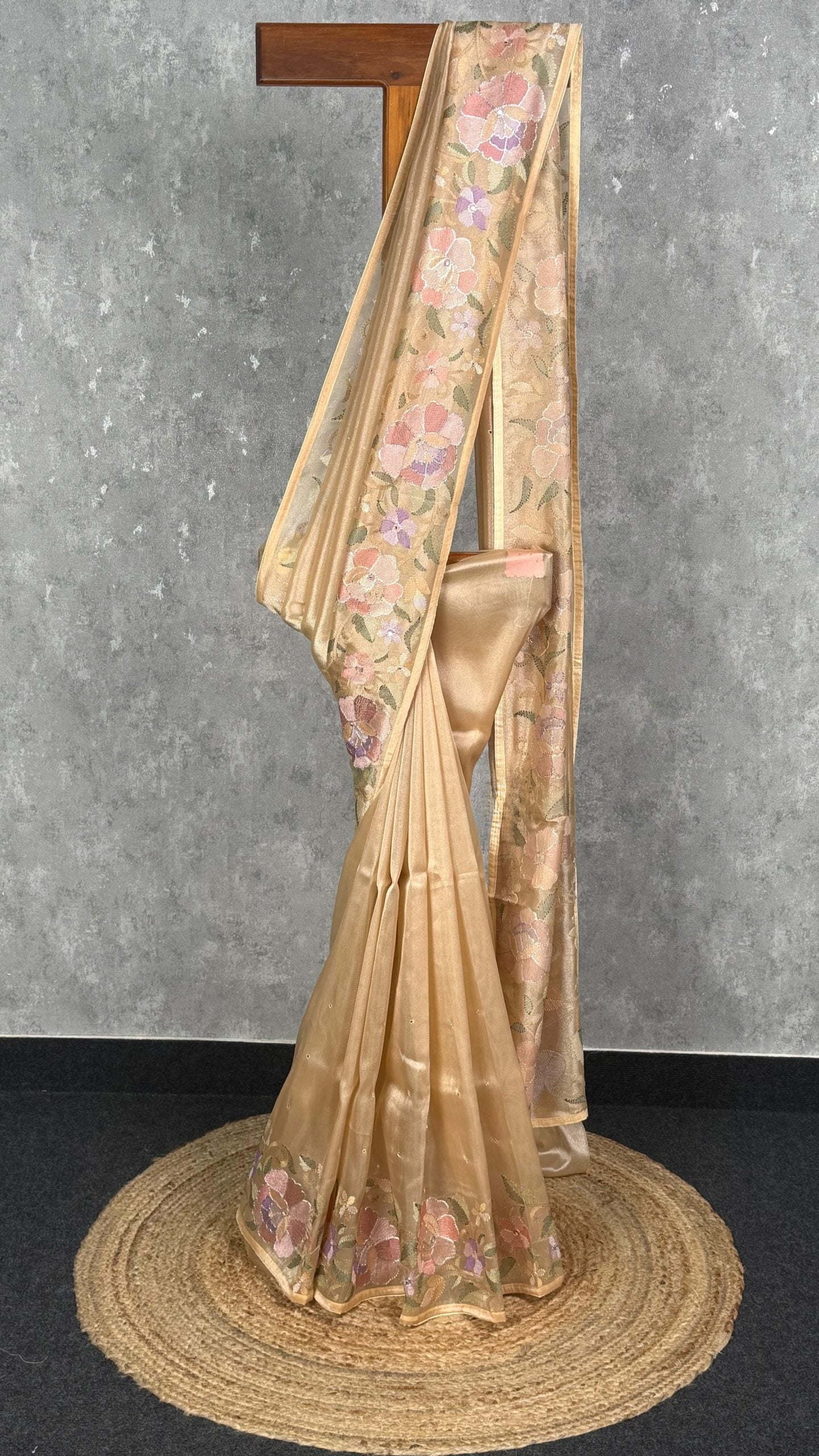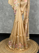 This saree features a graceful beige-gold shade that radiates subtle elegance. The beautifully woven multicolour floral motifs along the border and pallu add a soft, sophisticated charm. Perfect for festive occasions and daytime events, it offers a refined and timeless look.