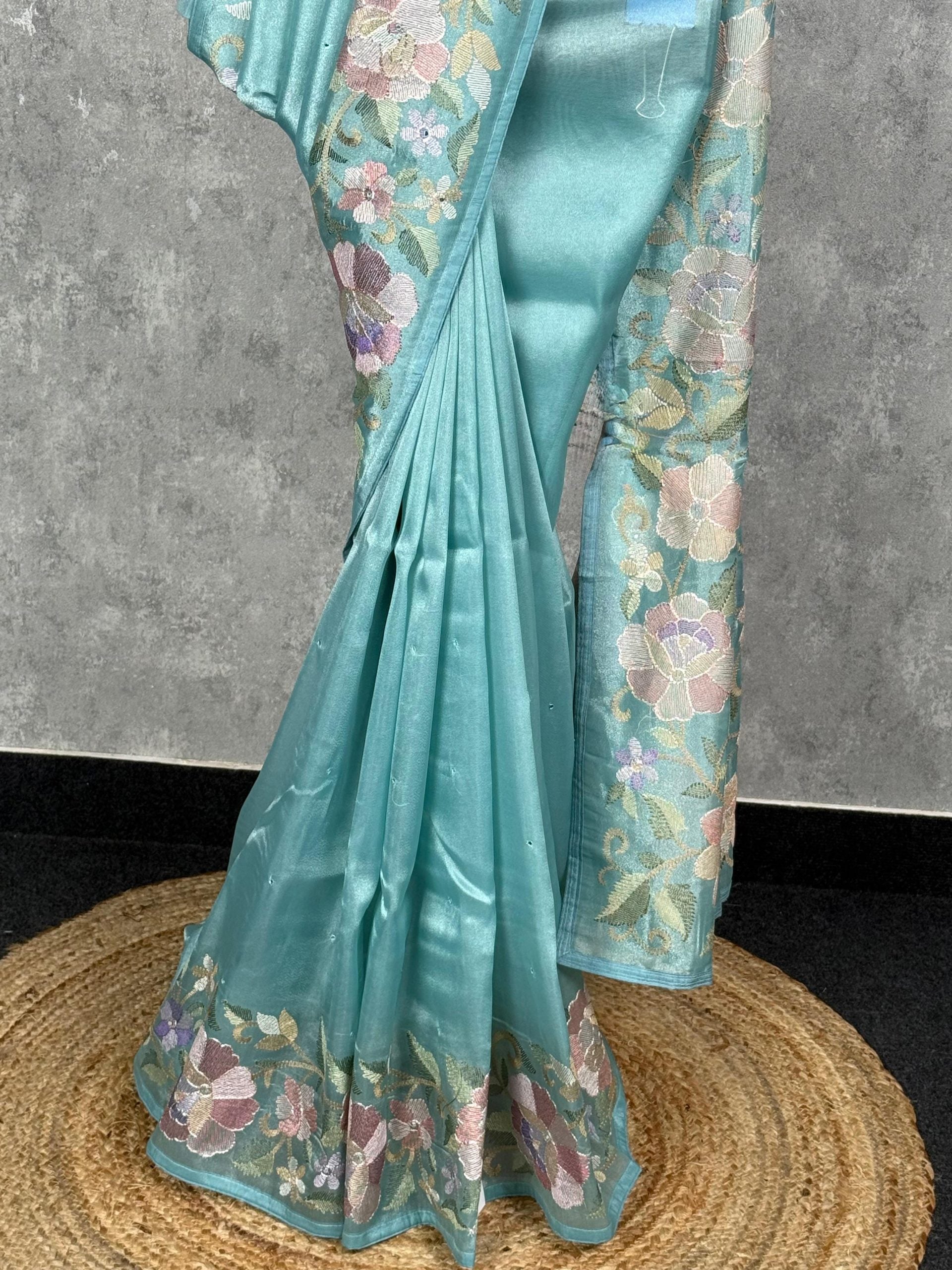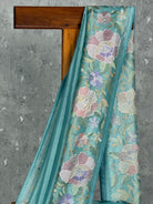 This saree features a stunning aqua teal shade that exudes freshness and elegance. The beautifully woven multicolour floral patterns along the border and pallu add a rich, artistic charm. Perfect for festive events and celebrations, it blends vibrant colour with traditional craftsmanship.