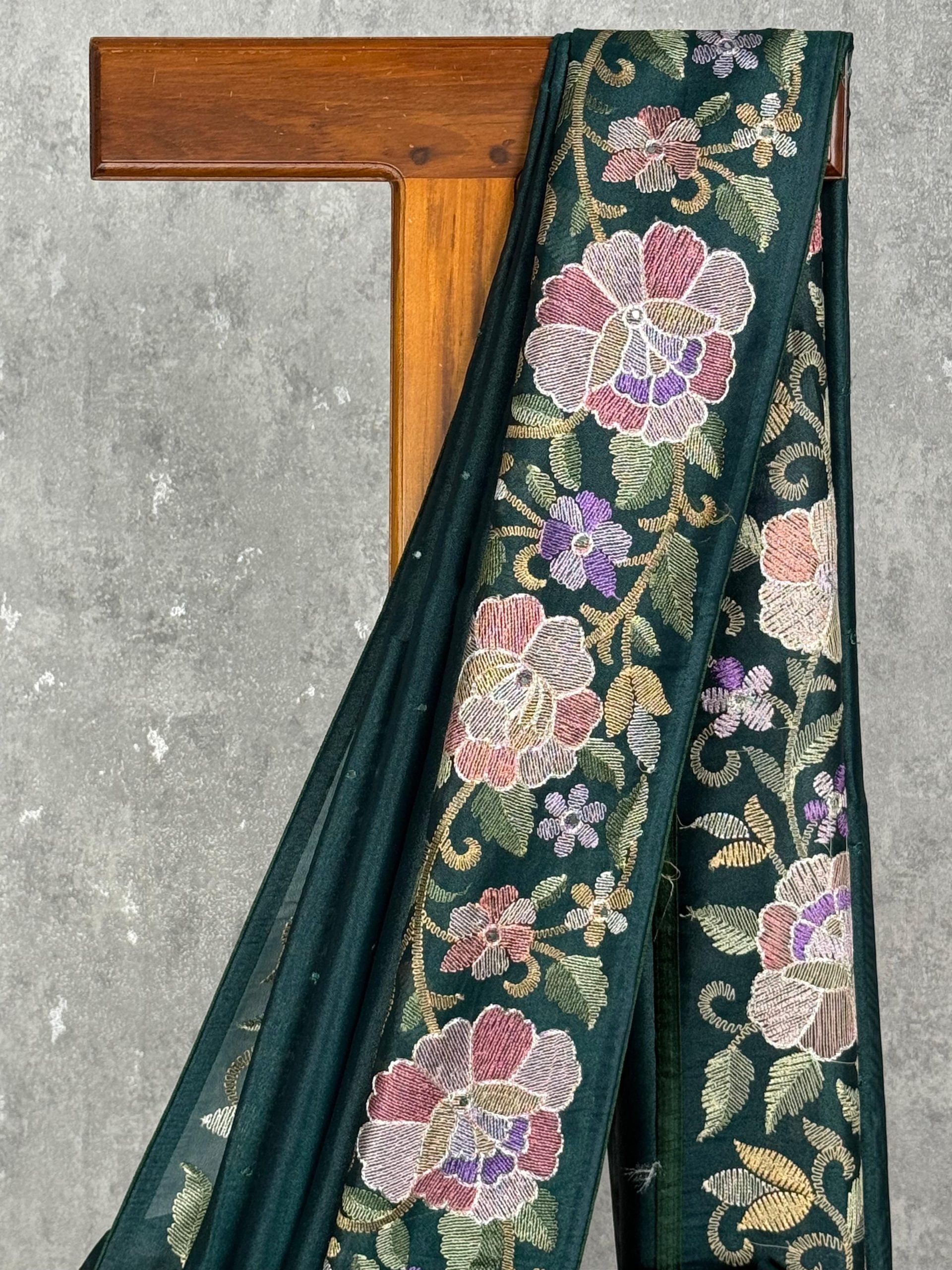 This saree features a rich bottle green shade that exudes elegance and depth. The beautifully woven multicolour floral motifs along the border and pallu add a vibrant and luxurious touch. Perfect for festive occasions and celebrations, it blends bold colour with exquisite craftsmanship.