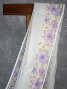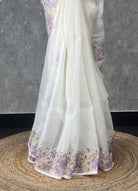 A soft Off white organza saree with delicate Kantha stitch embroidery. The border is decorated with purple colored floral designs. The saree comes with attached blouse piece that has printed flowers on the body.