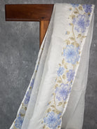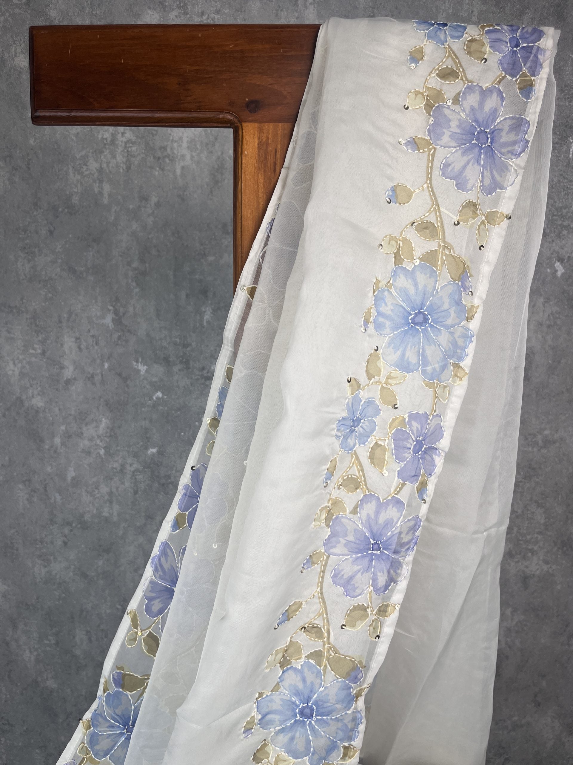 A soft Off white organza saree with delicate Kantha stitch embroidery. The border is decorated with blue colored floral designs. The saree comes with attached blouse piece that has printed flowers on the body.