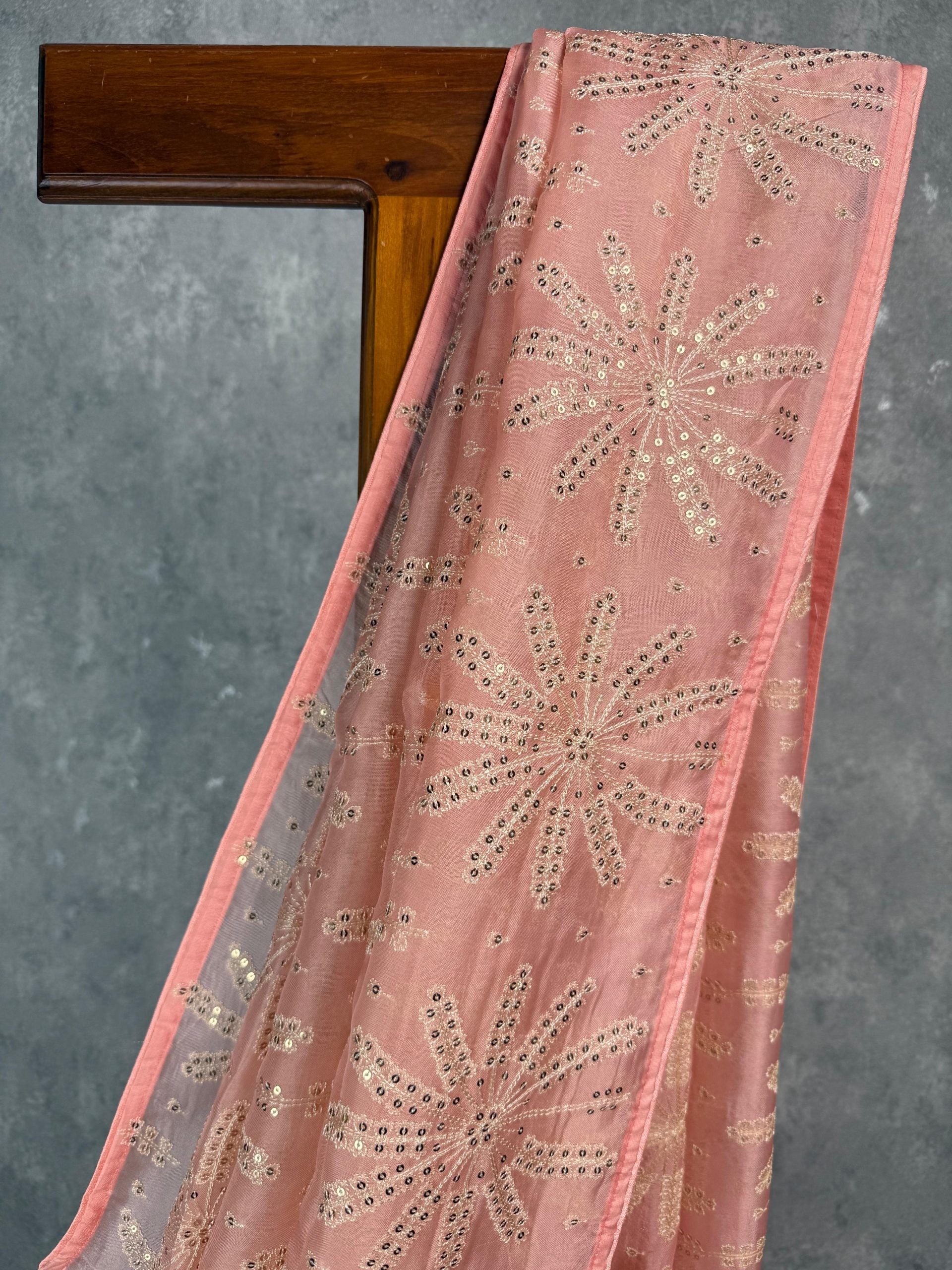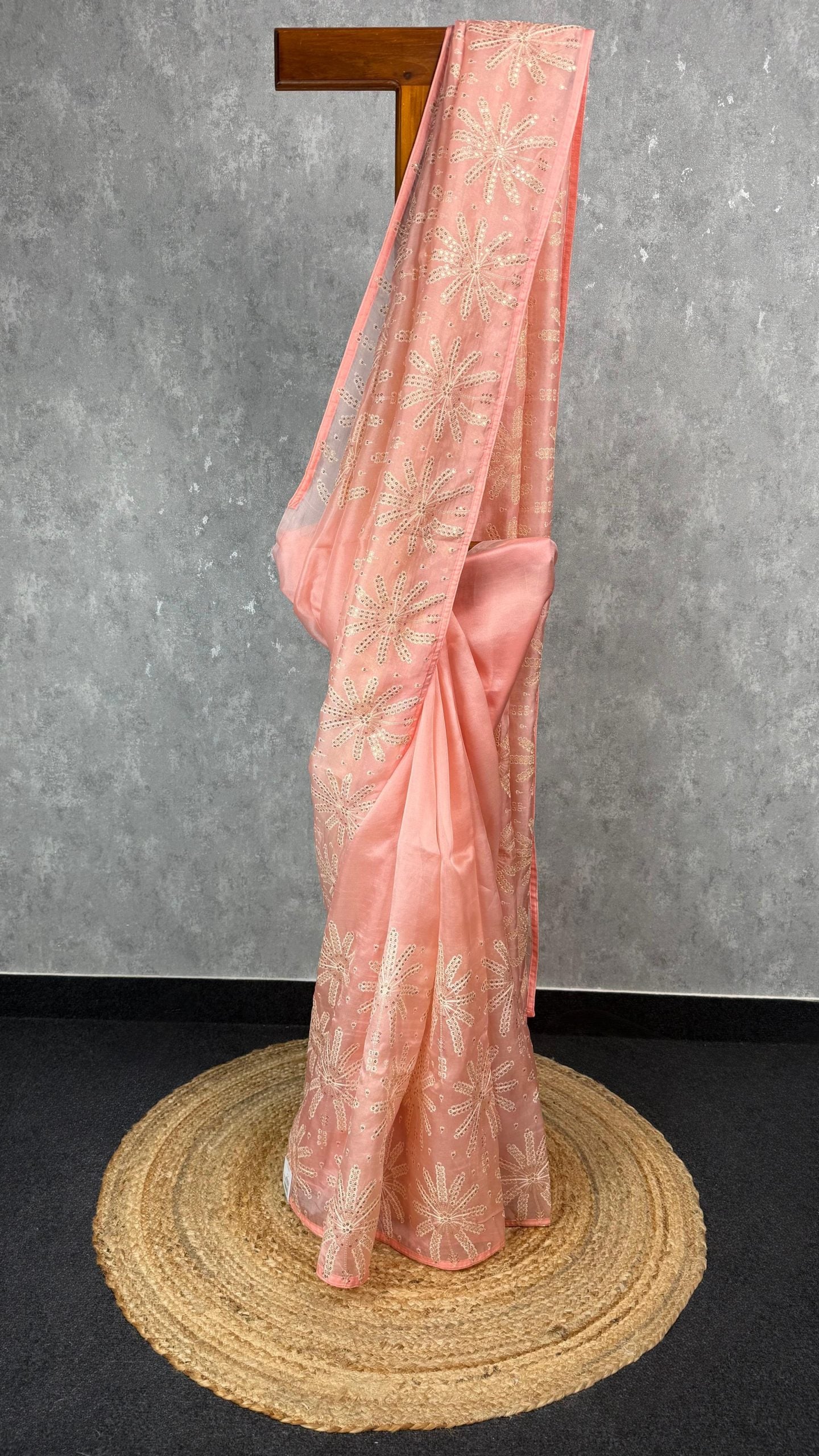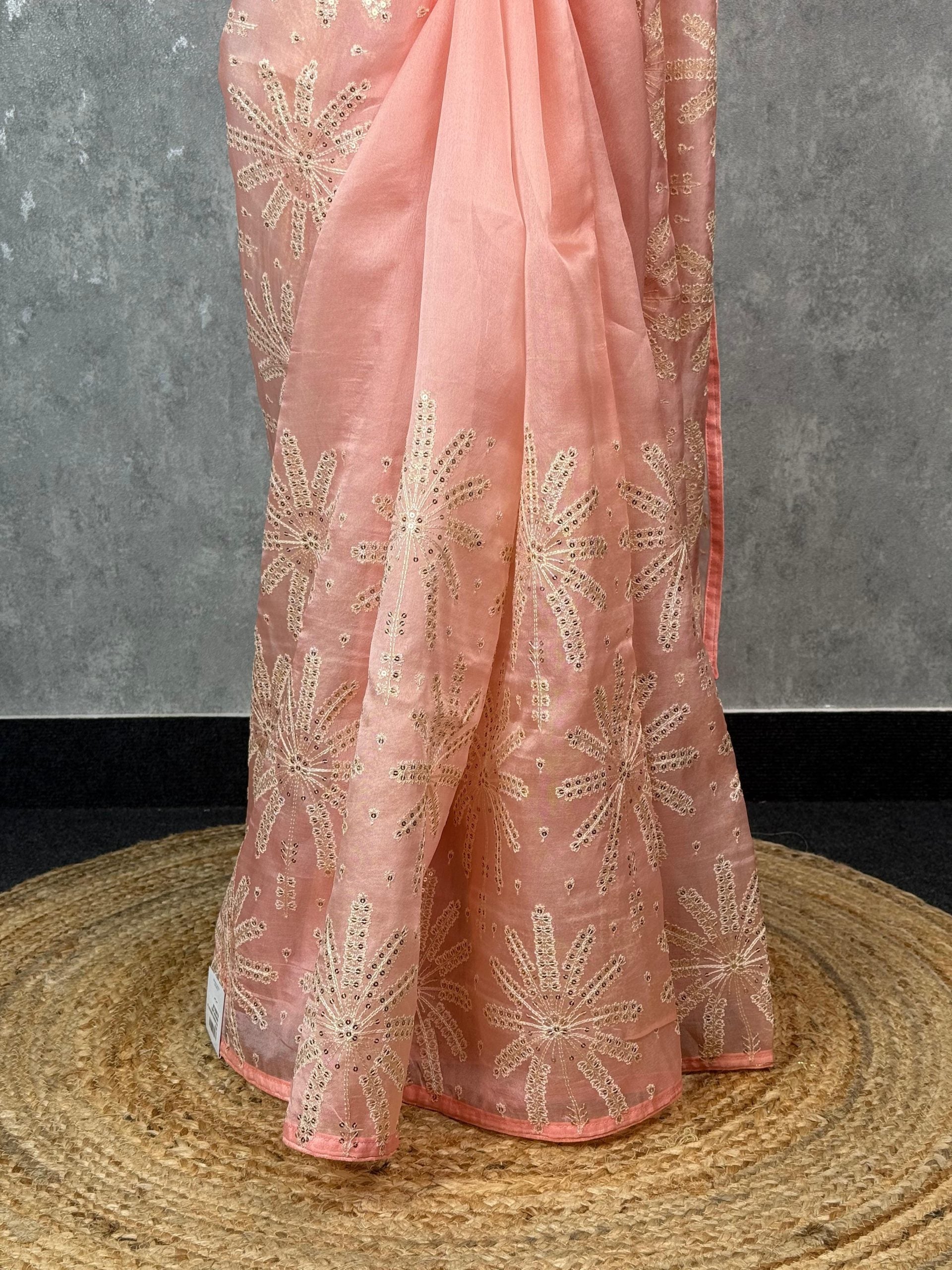 The soft peach silk organza saree features delicate floral embroidery in cream and gold tones. The design is embellished with sequins that add a subtle shimmer to the fabric. The saree has attached self color blouse piece.