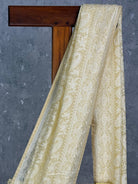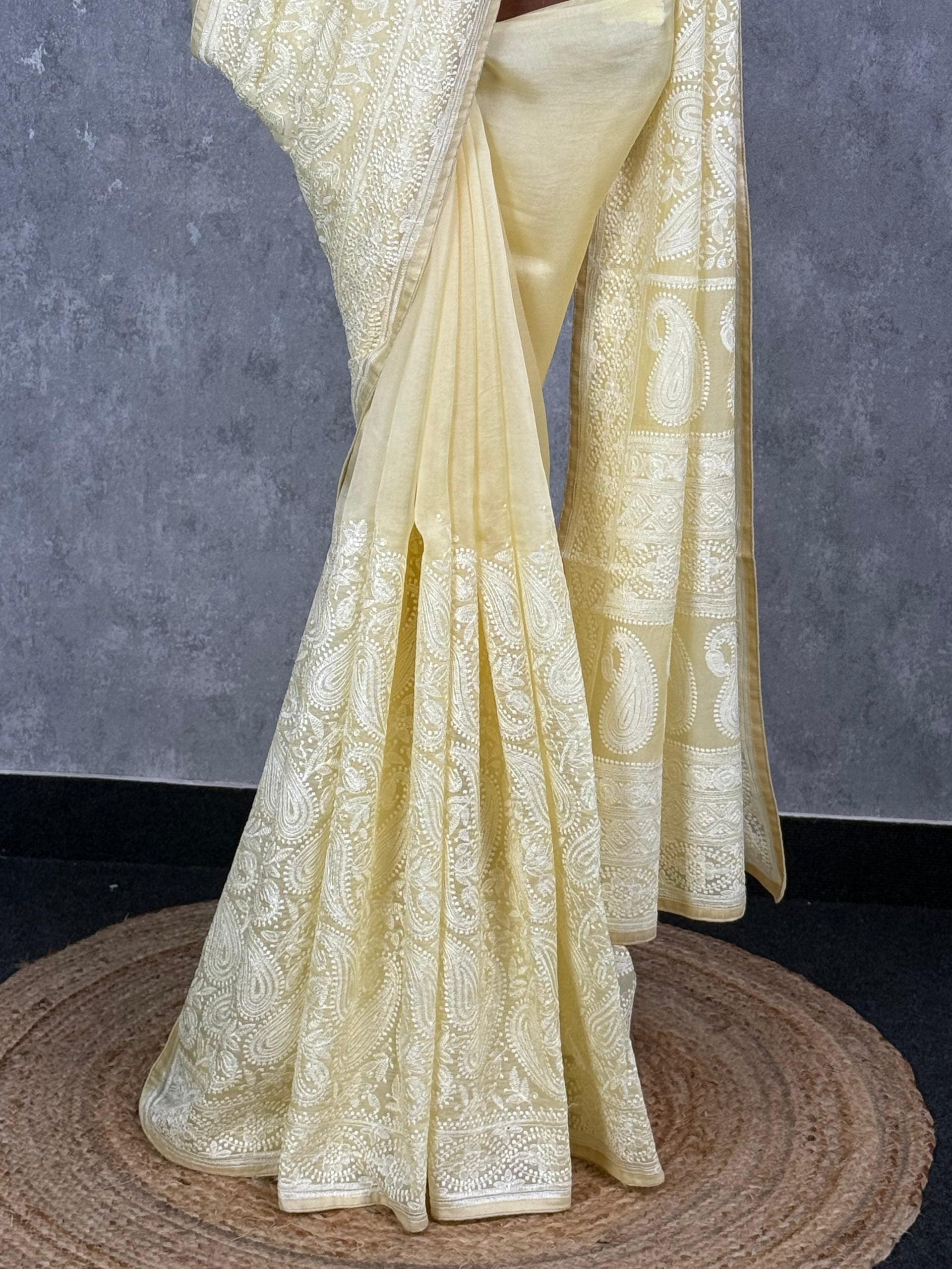 This elegant saree exudes timeless charm with its soft pastel yellow hue and intricate threadwork detailing. The delicate paisley and floral patterns across the fabric add a touch of sophistication, making it perfect for festive and traditional occasions. Its subtle sheen enhances the overall graceful appeal.