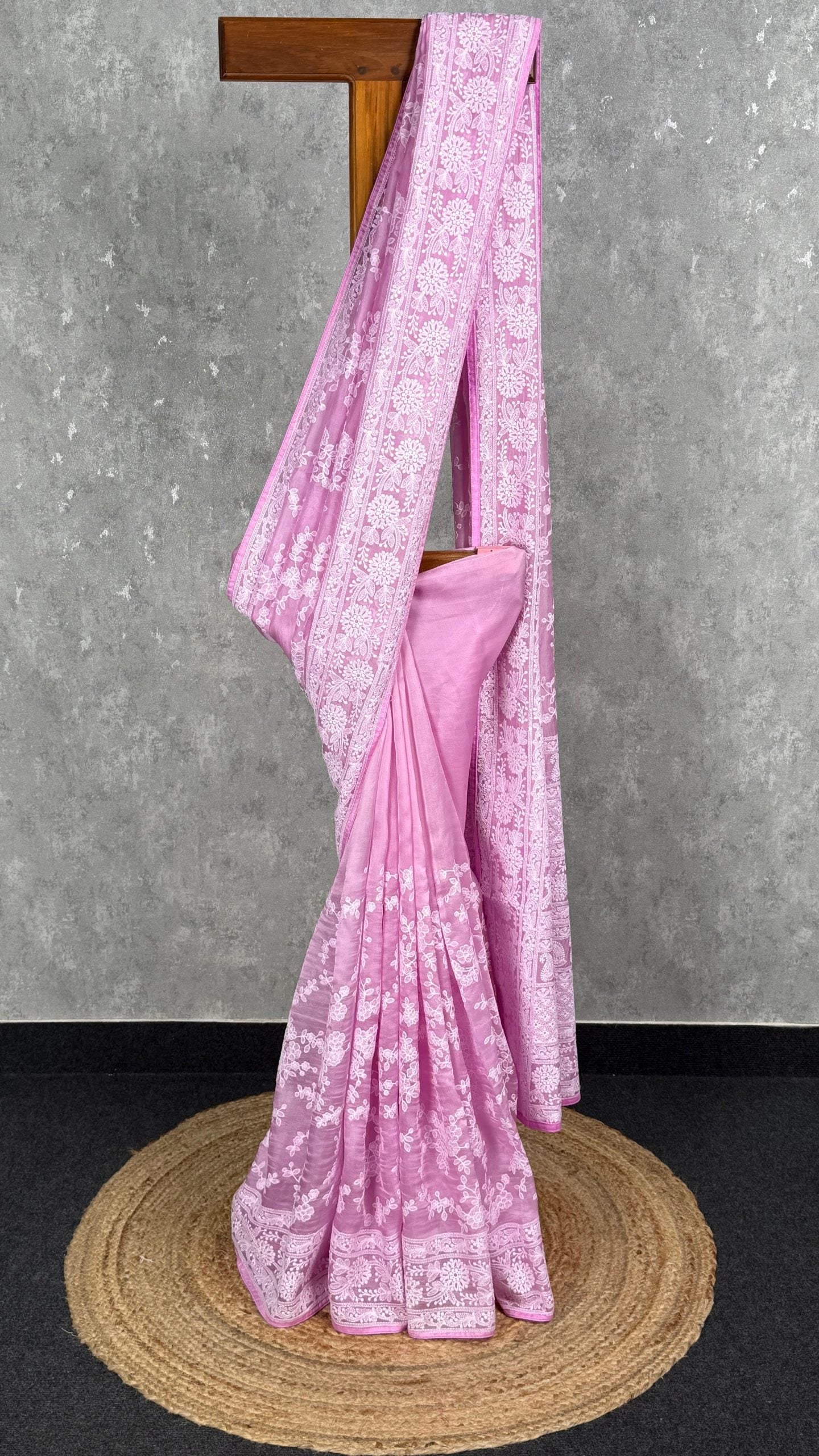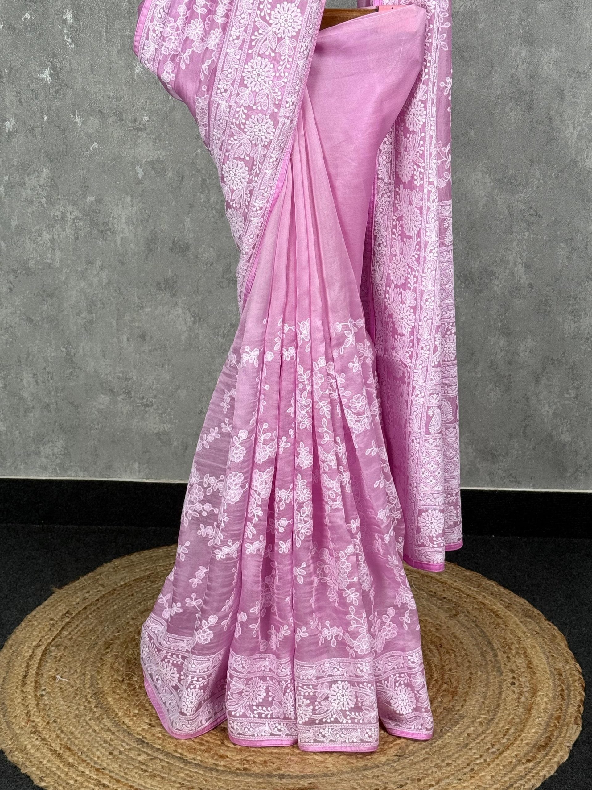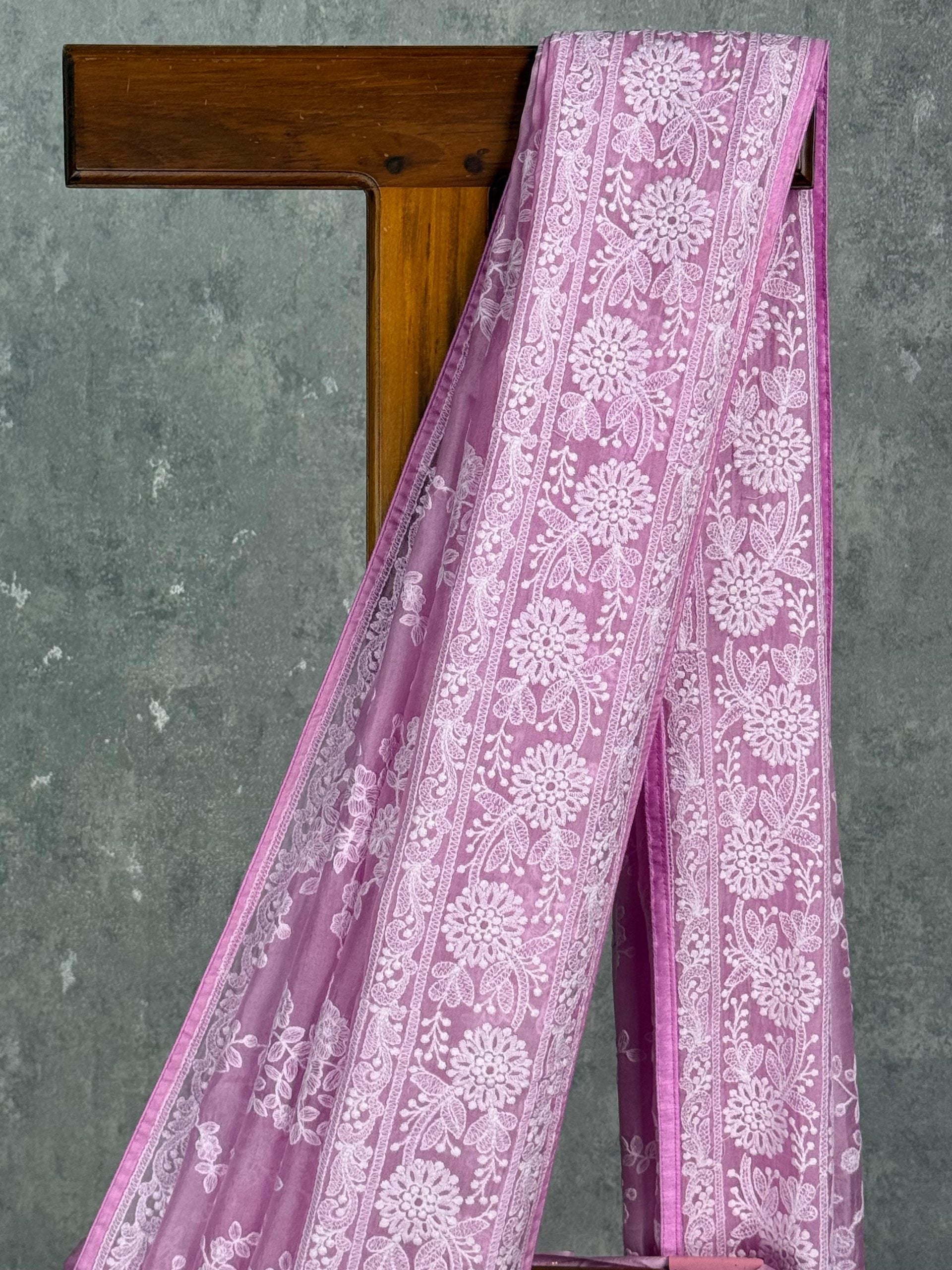 This elegant saree in a soft lavender-pink hue exudes grace and sophistication. Adorned with delicate white floral embroidery, it beautifully captures the essence of traditional artistry. Perfect for festive occasions or daytime events, it offers a refined and timeless appe