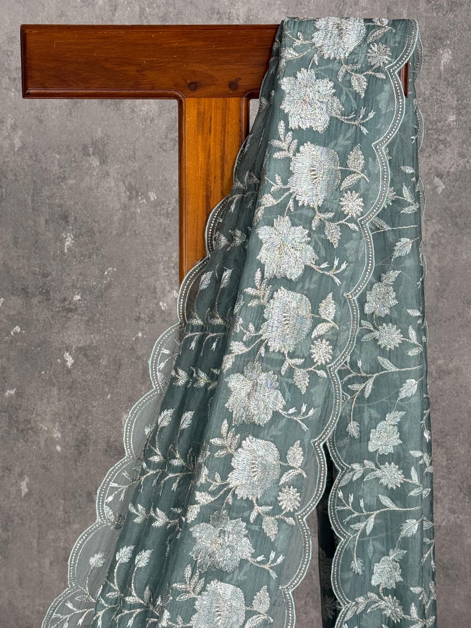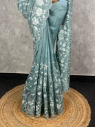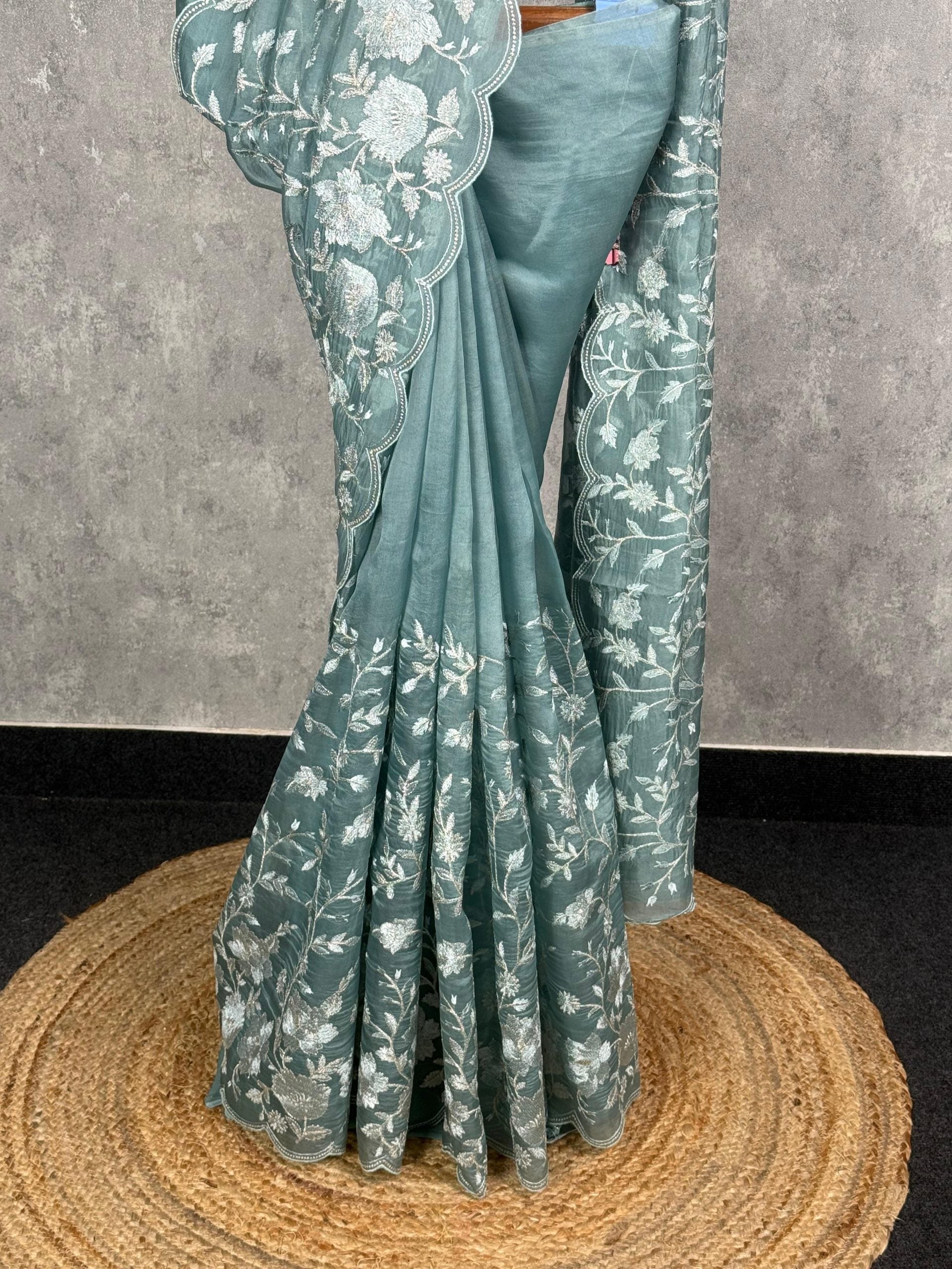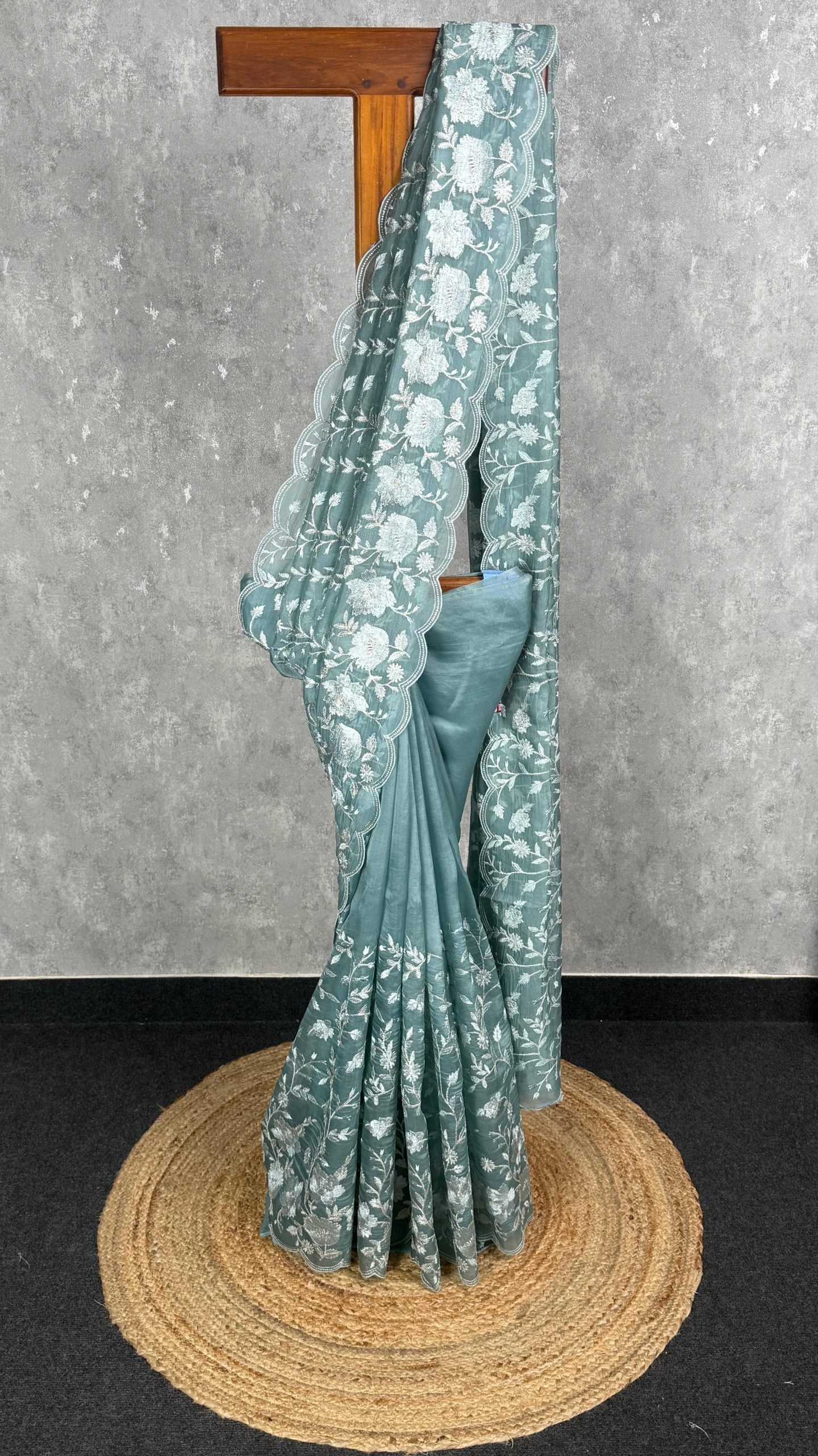 This elegant saree in a serene sea-green shade exudes refined beauty and sophistication. The delicate white floral embroidery with scalloped edges adds a graceful charm to its design. Perfect for festive gatherings or special occasions, it captures timeless elegance with a modern touch.