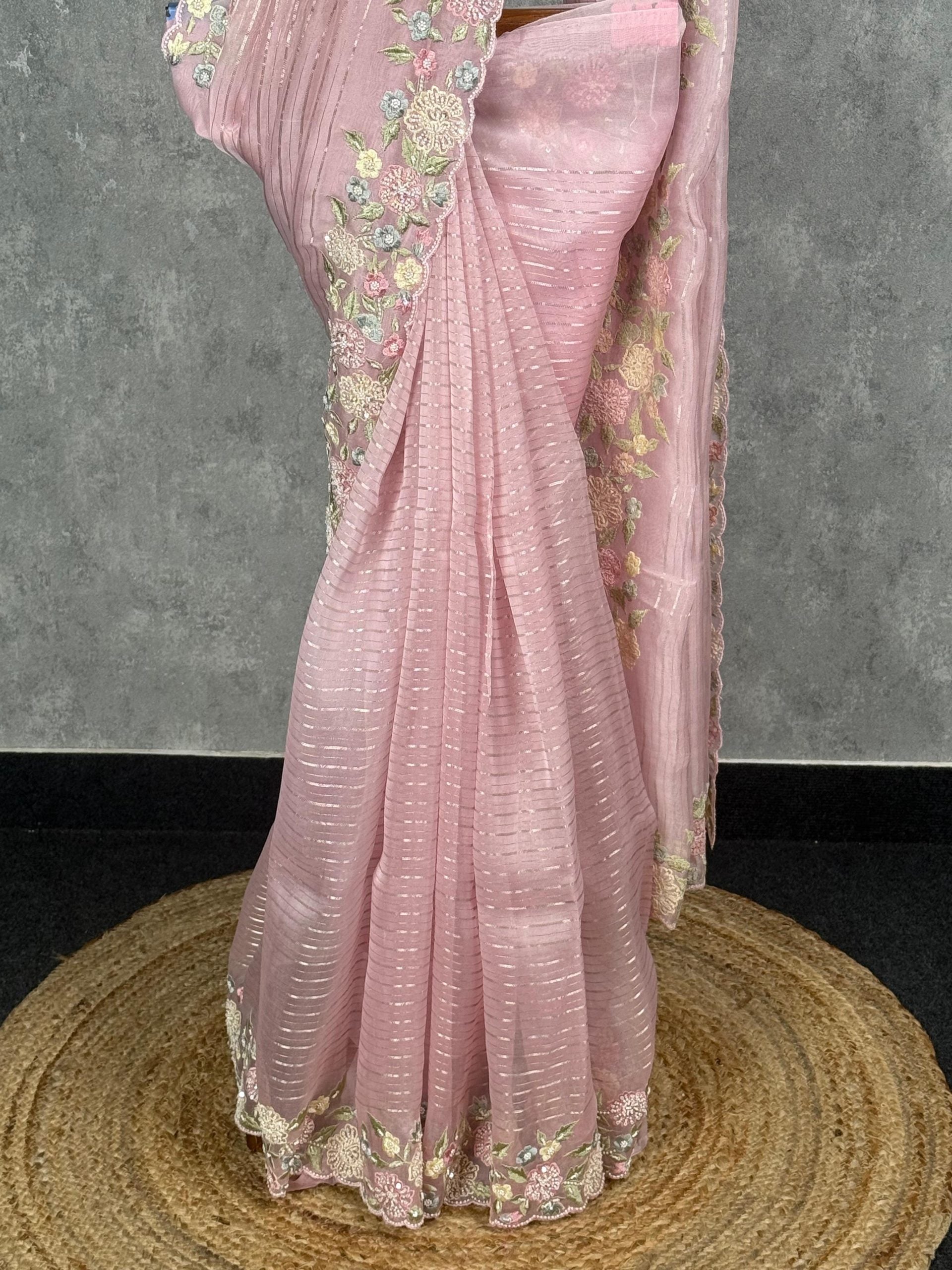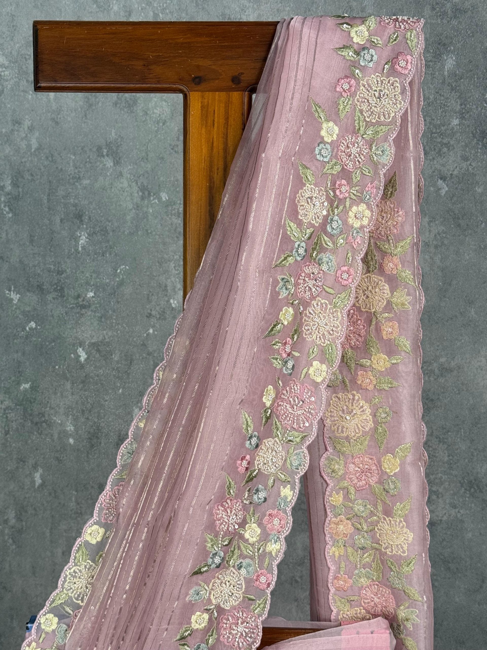 This enchanting saree in a soft blush pink hue radiates elegance and charm. Adorned with delicate floral embroidery and subtle shimmer detailing, it perfectly balances sophistication with a feminine touch. Ideal for festive occasions or celebrations, it exudes a graceful and timeless appeal.