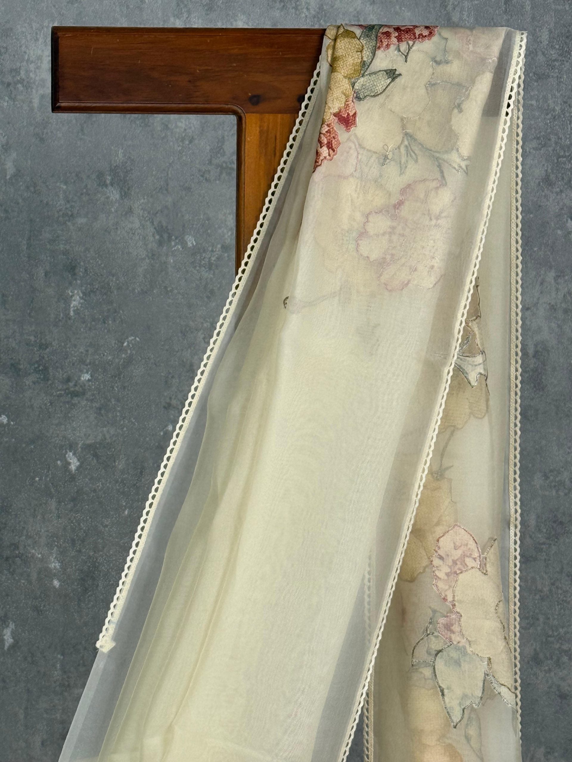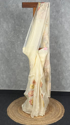 This elegant saree in a soft ivory-cream shade exudes effortless charm and sophistication. The subtle floral embroidery paired with its sheer, lightweight drape adds a delicate and graceful touch. Perfect for daytime events, festive gatherings, or intimate celebrations, it offers a timeless and refined look.