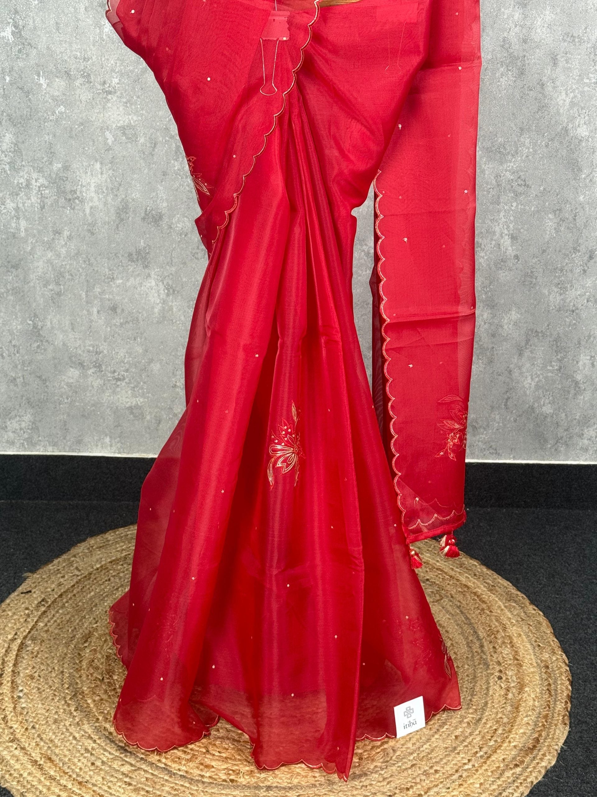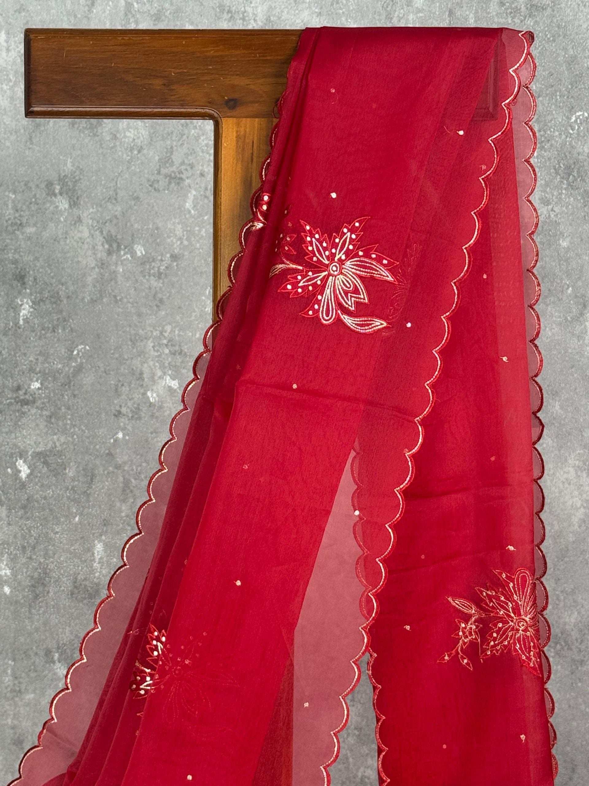 This stunning red saree exudes timeless elegance and charm. Adorned with delicate floral embroidery and scalloped borders, it perfectly blends tradition with subtle sophistication. Ideal for festive occasions or celebrations, this saree radiates grace and confidence.