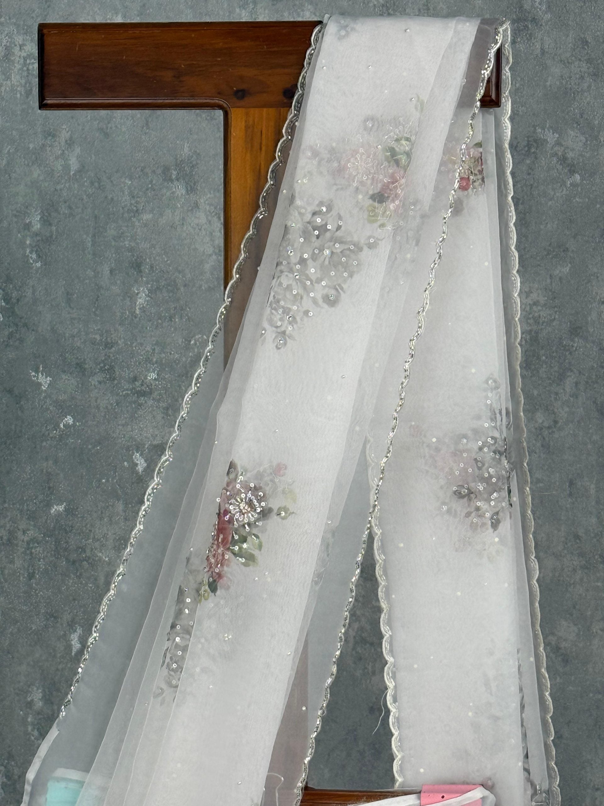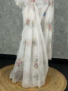This saree showcases a soft off-white base adorned with delicate floral embroidery in pastel pink and silver hues. The subtle shimmer adds a refined elegance, making it perfect for festive occasions or formal gatherings. Its light, graceful design exudes timeless sophistication.