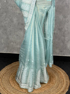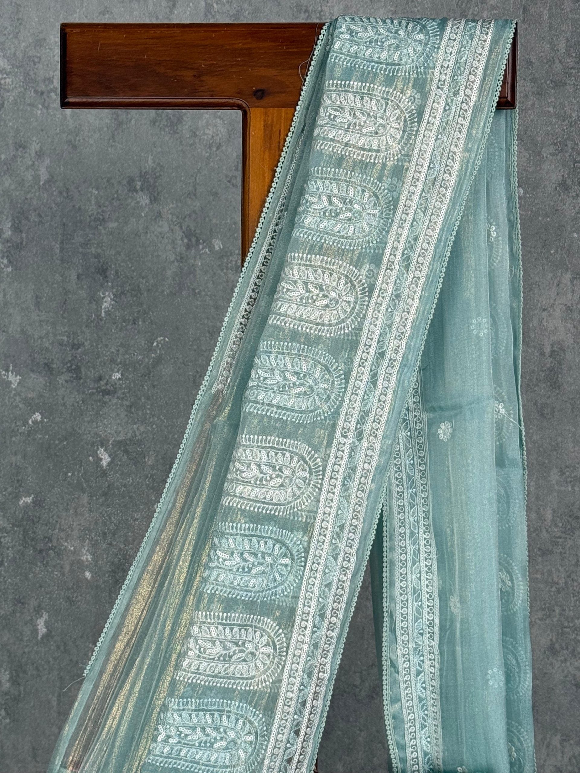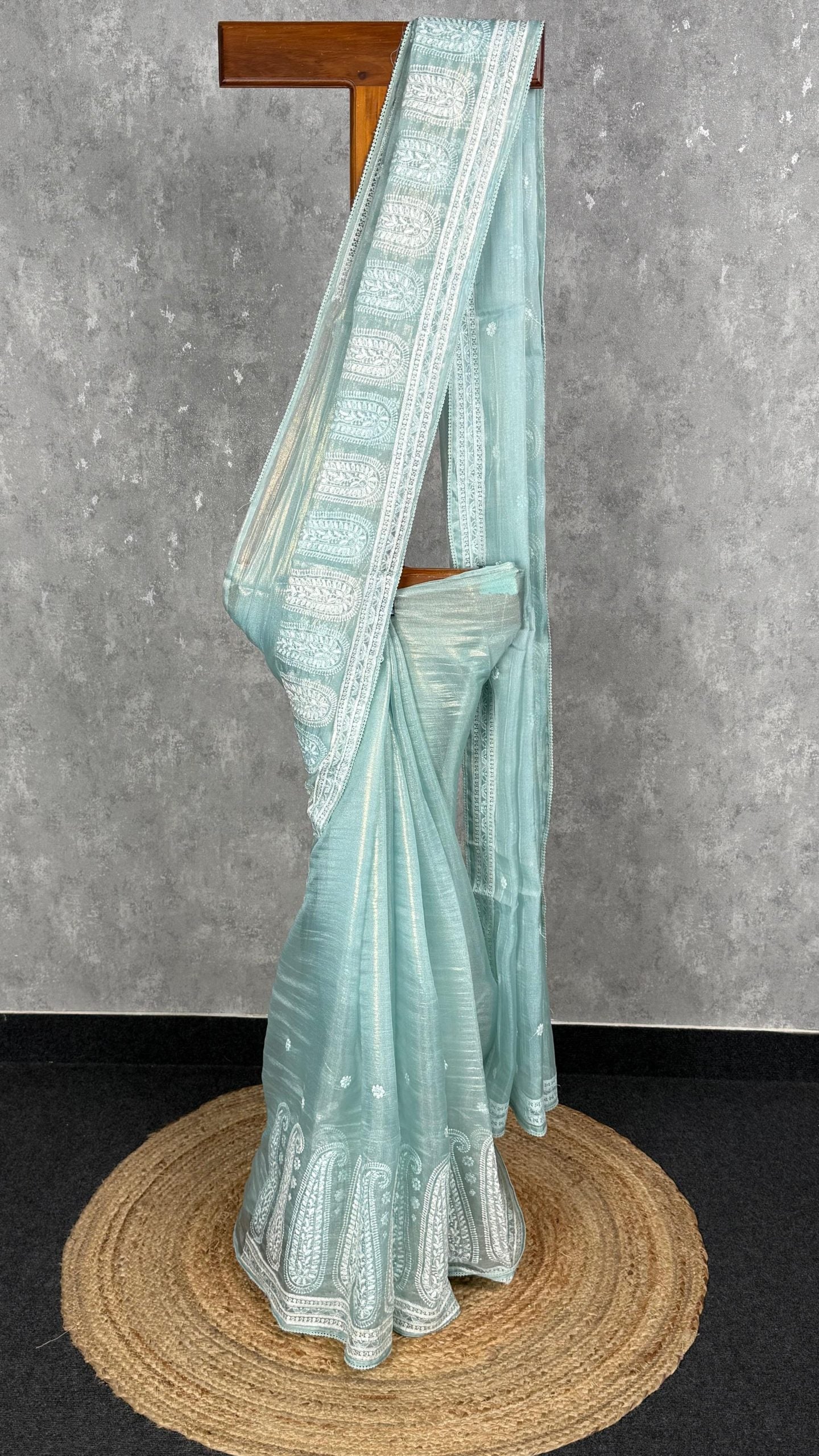 This saree showcases a soothing mint green shade beautifully enhanced with intricate white thread embroidery. Its soft, sheer texture and delicate detailing give it an elegant and refreshing appeal. Perfect for daytime occasions, festive gatherings, or anyone who loves subtle yet graceful ethnic wear.