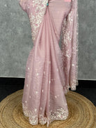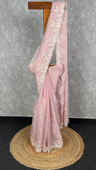 This saree exudes a soft and graceful charm with its pastel pink shade complemented by delicate white embroidery. The intricate floral detailing adds an elegant, feminine touch that enhances its overall sophistication. Perfect for daytime events and festive occasions, it offers a timeless and refreshing look.