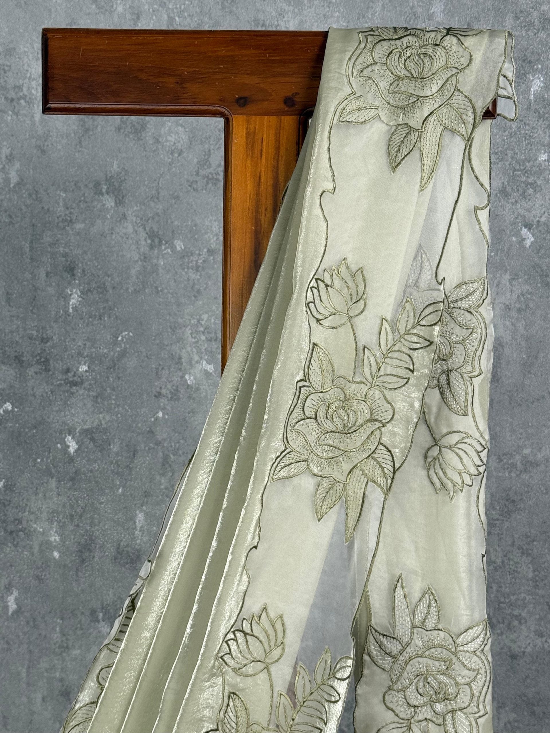 This saree features a soft pastel green shade that brings a refreshing and elegant charm. The delicate floral embroidery along the border and pallu adds a refined, graceful touch. Perfect for festive occasions and daytime events, it blends subtle colour with timeless sophistication.