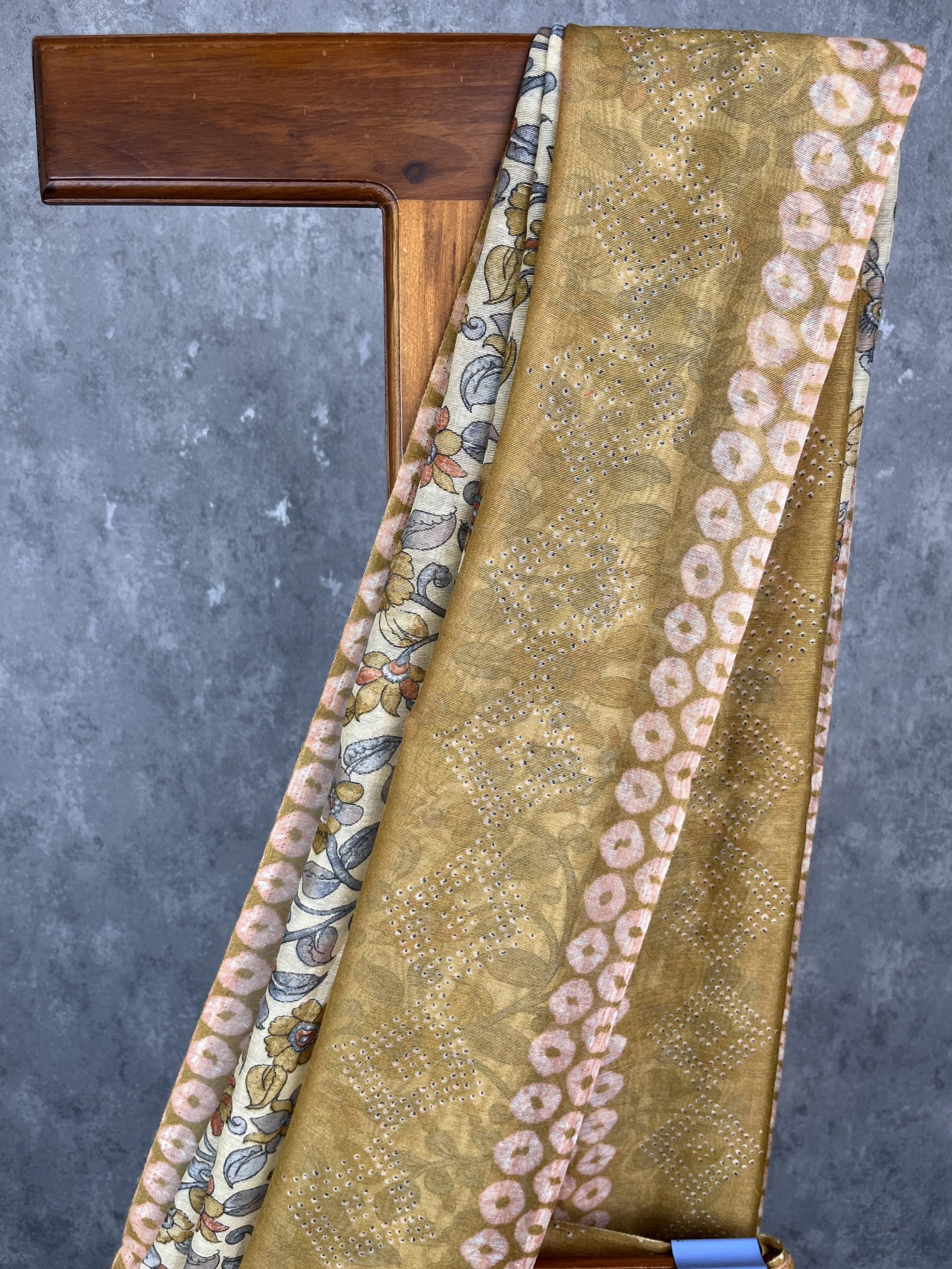 Cotton linen saree in yellow colour with kalamkari print all over the body. The saree is very light weight and easy to drape.