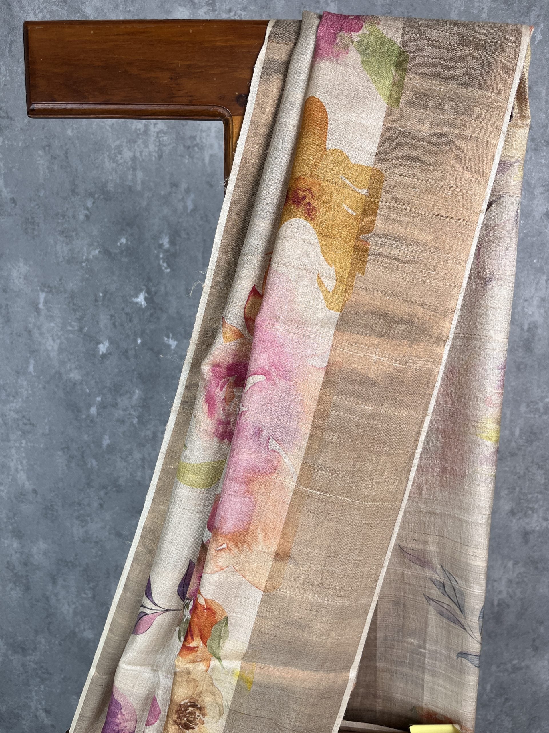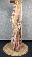 beautiful semi Tussar saree in a cream tone, adorned with elegant floral prints. The saree comes with attached blouse piece.