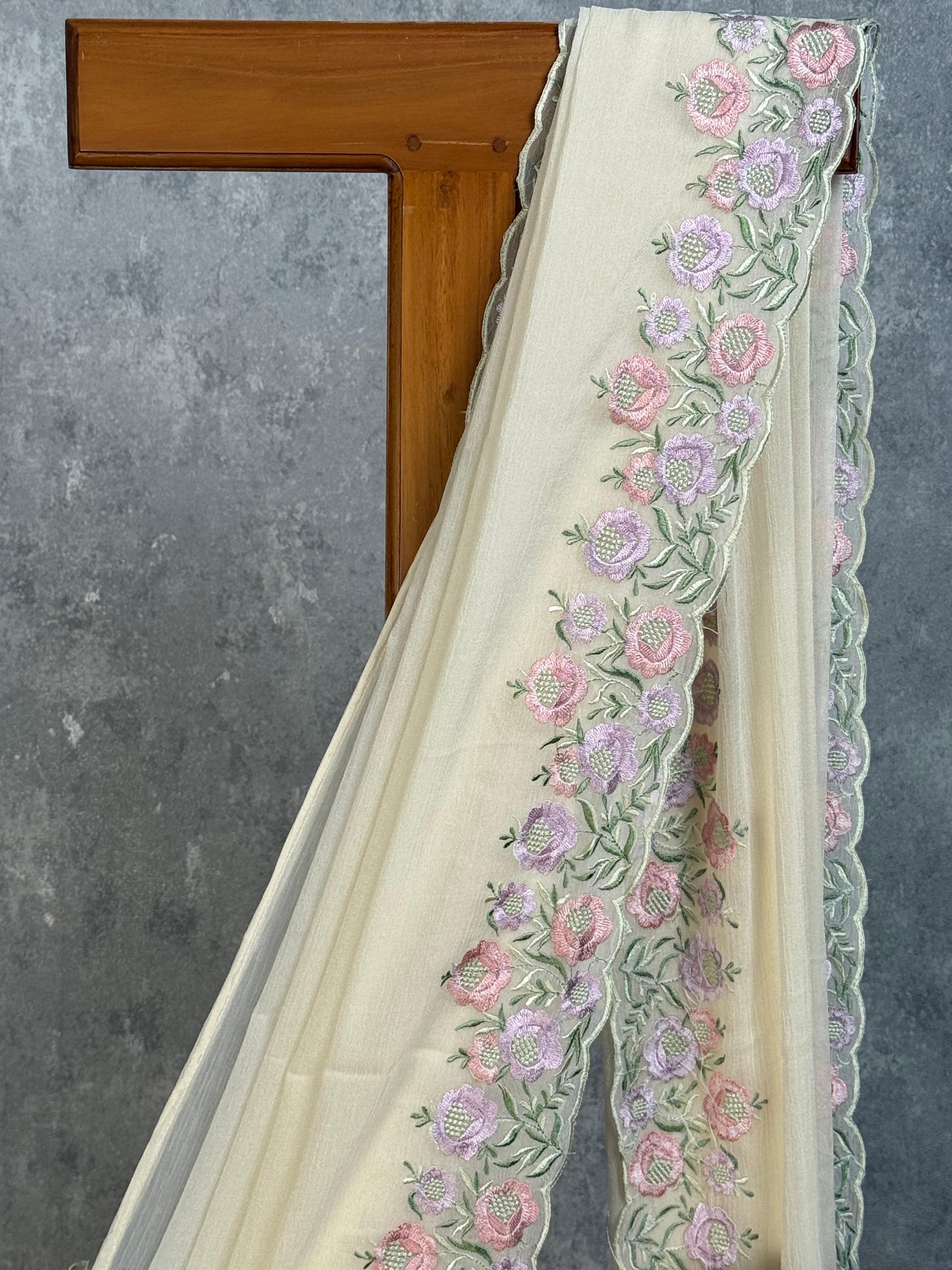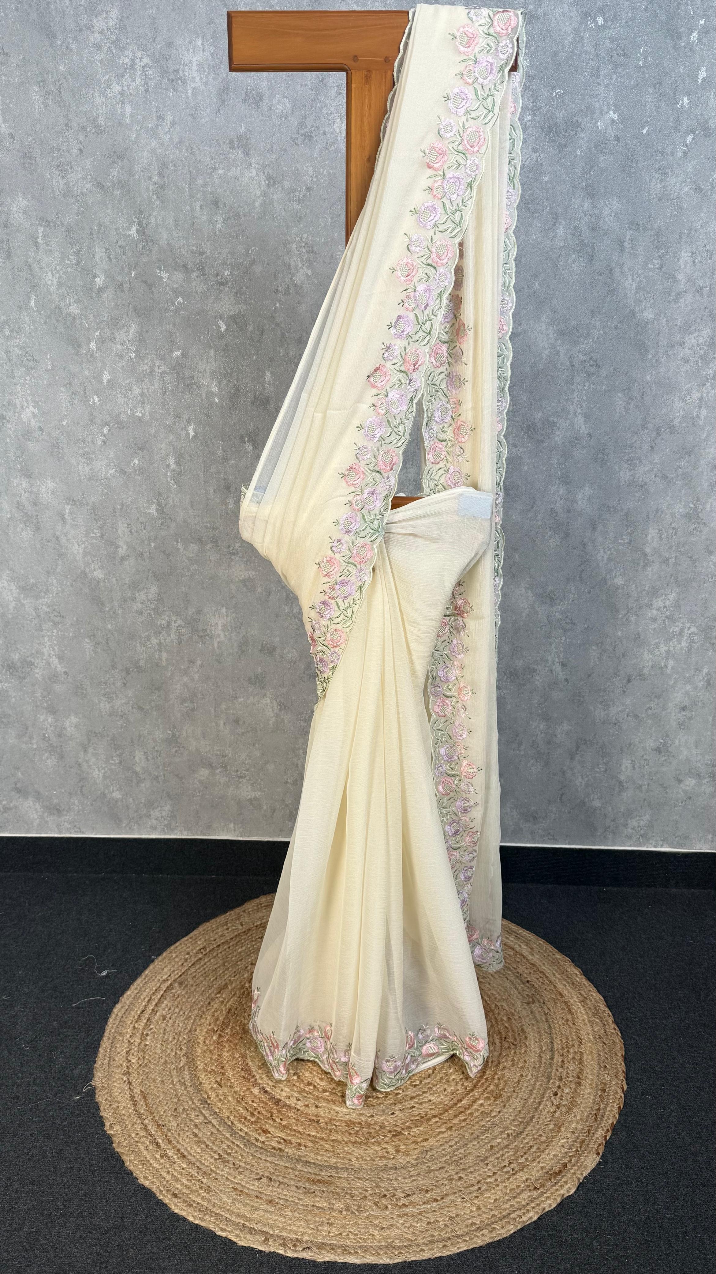 Drape yourself in timeless elegance with this stunning chiffon georgette saree, perfect for weddings and festive celebrations. Adorned with intricate embroidery work, this saree combines traditional craftsmanship with a graceful, flowing silhouette that flatters every occasion. The soft, lightweight fabric ensures comfort throughout the day while the detailed embellishments add a touch of sophistication to your ethnic wardrobe.