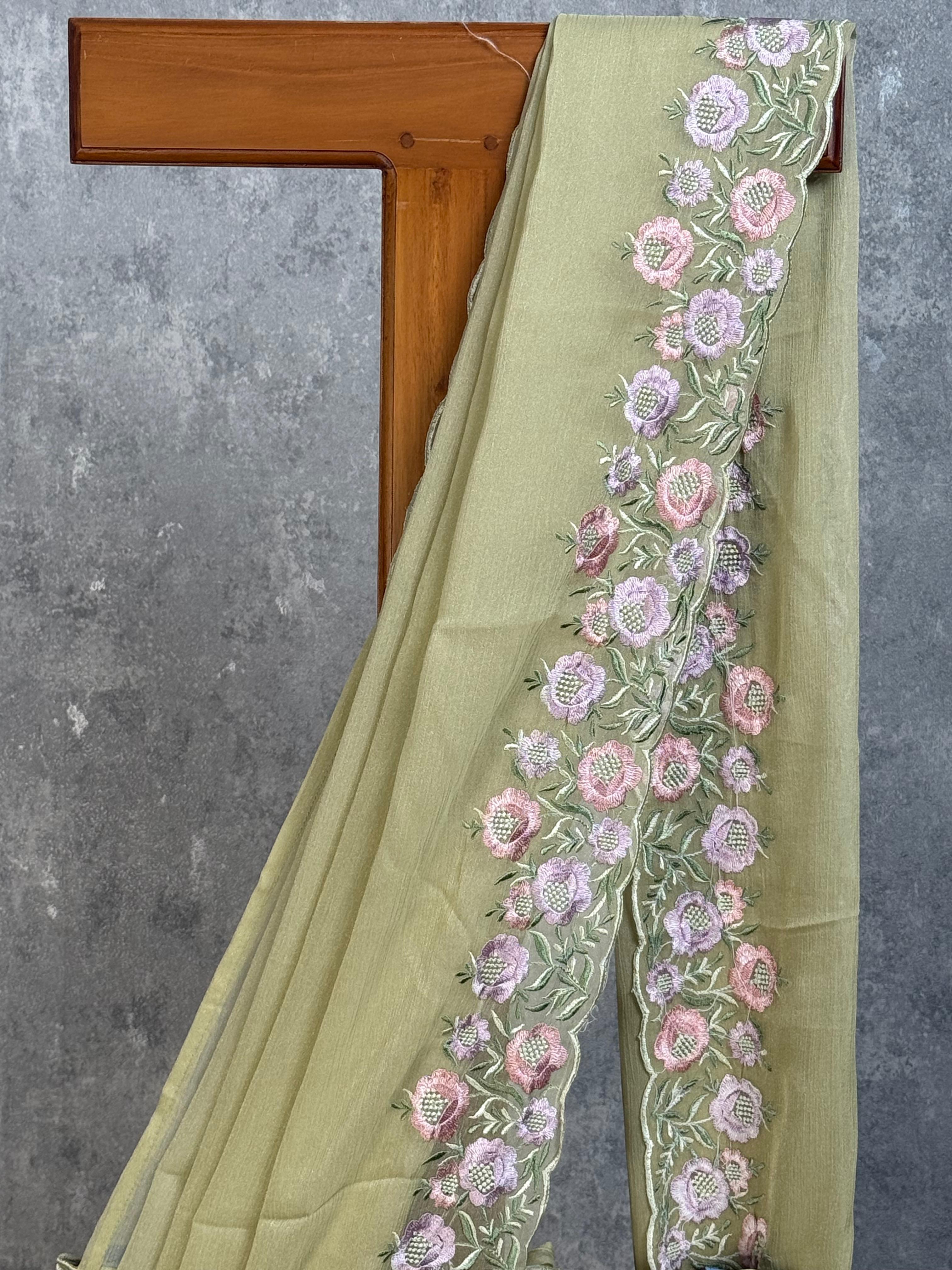 Drape yourself in timeless elegance with this stunning chiffon georgette saree, perfect for weddings and festive celebrations. Adorned with intricate embroidery work, this saree combines traditional craftsmanship with a graceful, flowing silhouette that flatters every occasion. The soft, lightweight fabric ensures comfort throughout the day while the detailed embellishments add a touch of sophistication to your ethnic wardrobe.