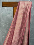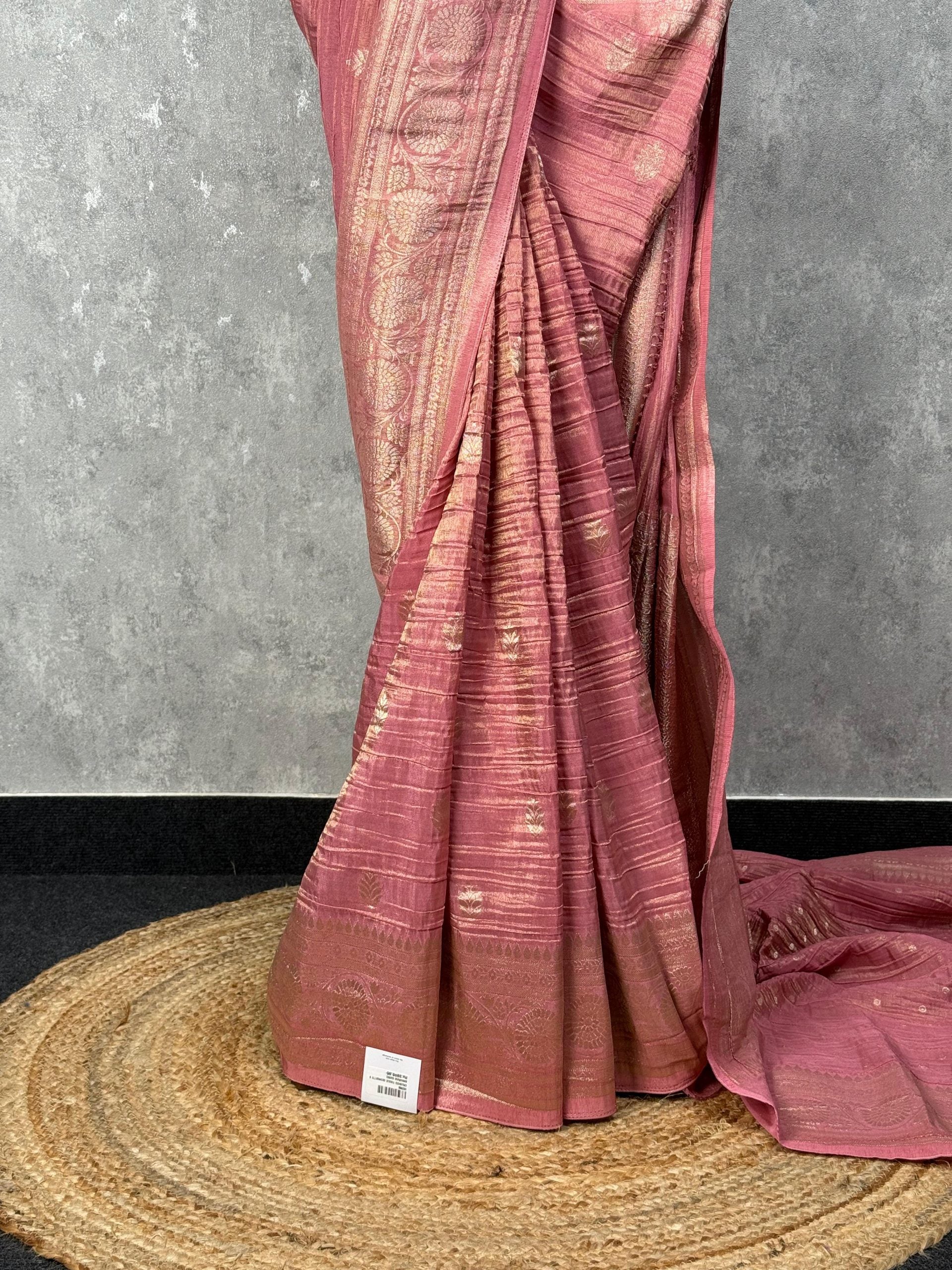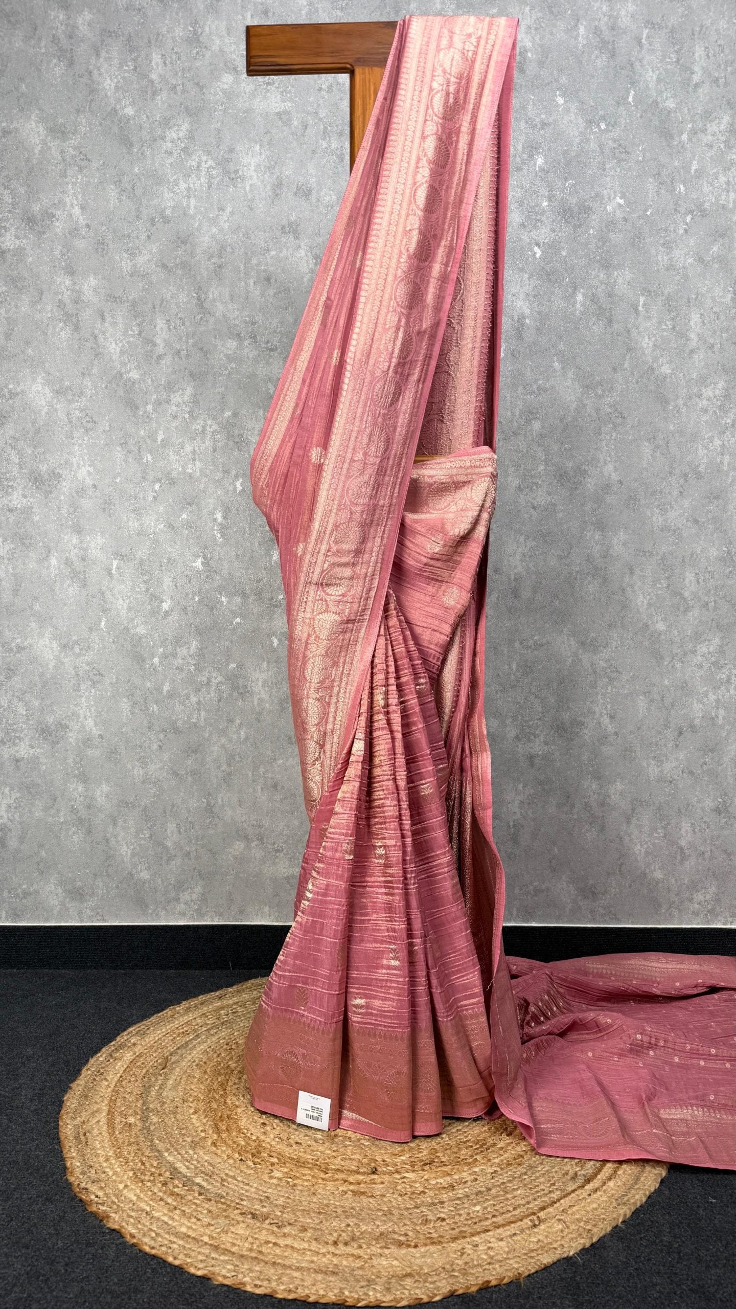 This is a graceful crushed tissue silk Banarasi saree in a beautiful pink shade. It features delicate golden zari weaving along the border and pallu, adding a touch of elegance. The crushed texture enhance its traditional charm. The saree comes with self color blouse piece.