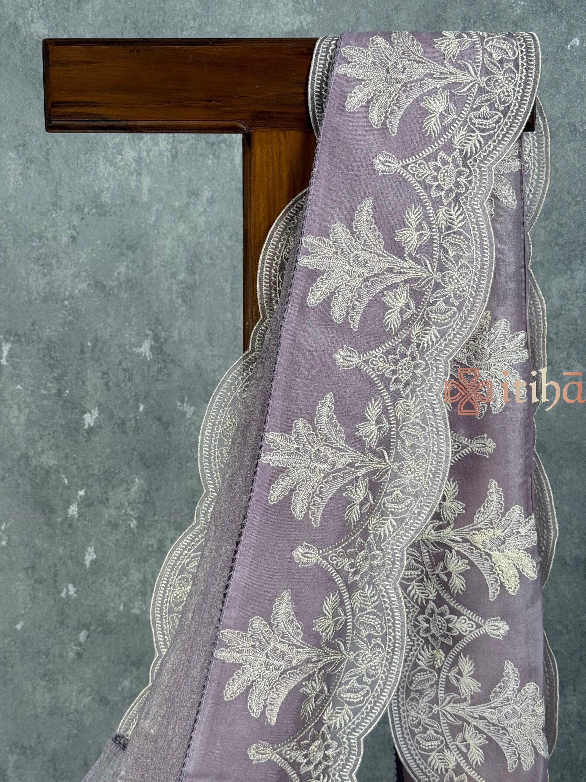 This crushed tissue silk saree features a delicate onion pink colour with intricate white floral embroidery along the borders and pallu. The saree showcases a beautiful blend of texture and pattern through its crushed tissue silk fabric. The white floral motifs add an elegant touch to the overall design. The saree comes with attached blouse piece.
