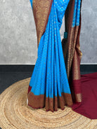This semi crepe Banarasi saree features a striking blue body with gold zari contrast borders. The borders are adorned with intricate gold patterns, adding a touch of elegance. The saree also boasts gold zari accents on the body, creating a beautiful contrast. The overall design showcases a harmonious blend of blue, gold, and maroon colours.