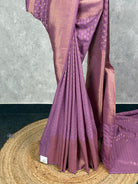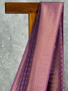 This semi crepe gold zari Banarasi saree features a beautiful lilac colour with subtle gold zari patterns. The saree showcases intricate gold zari detailing throughout its fabric. It has a textured pattern that adds depth to the overall design. The saree is draped elegantly, highlighting its rich texture and zari work. The saree comes with attached self color blouse piece.