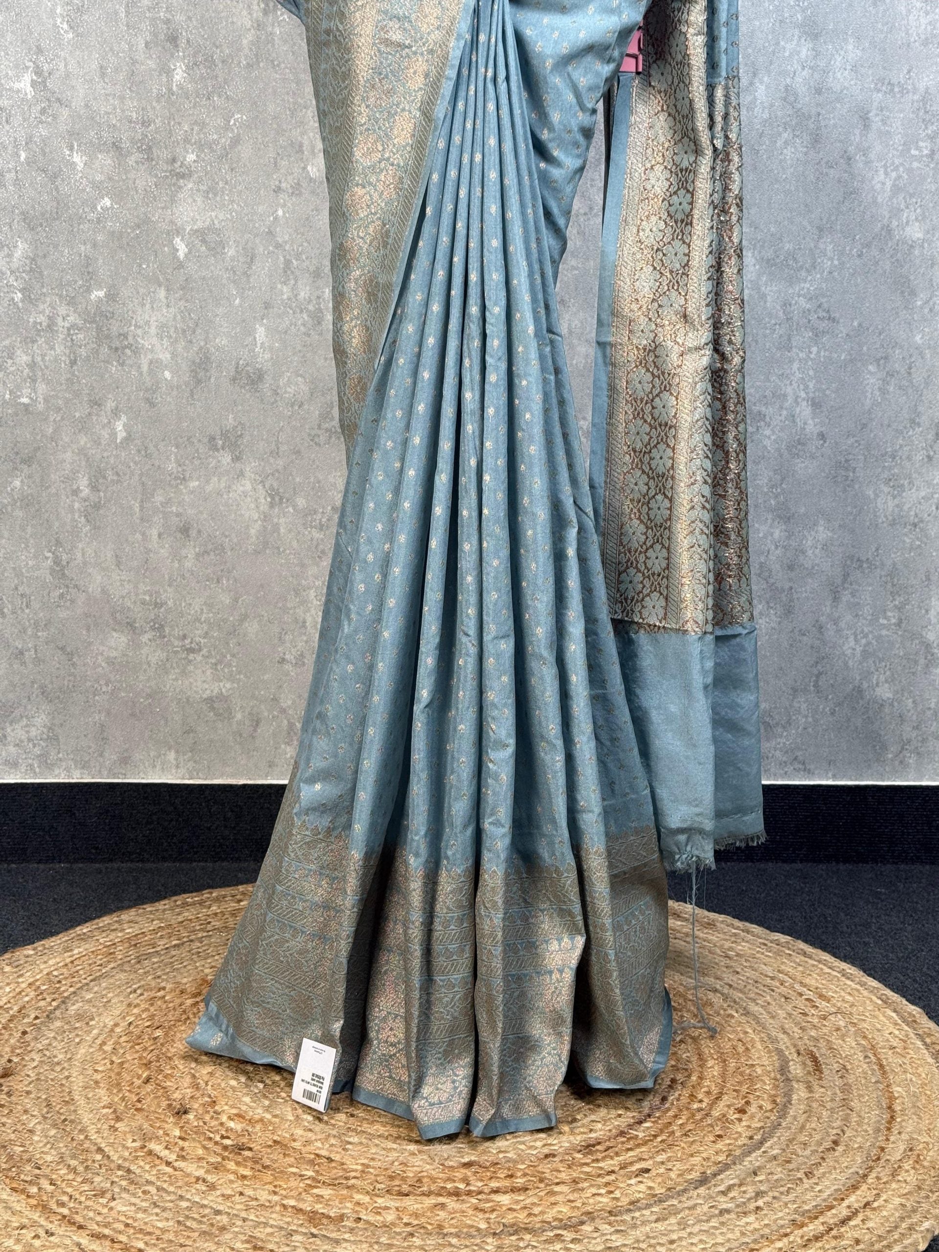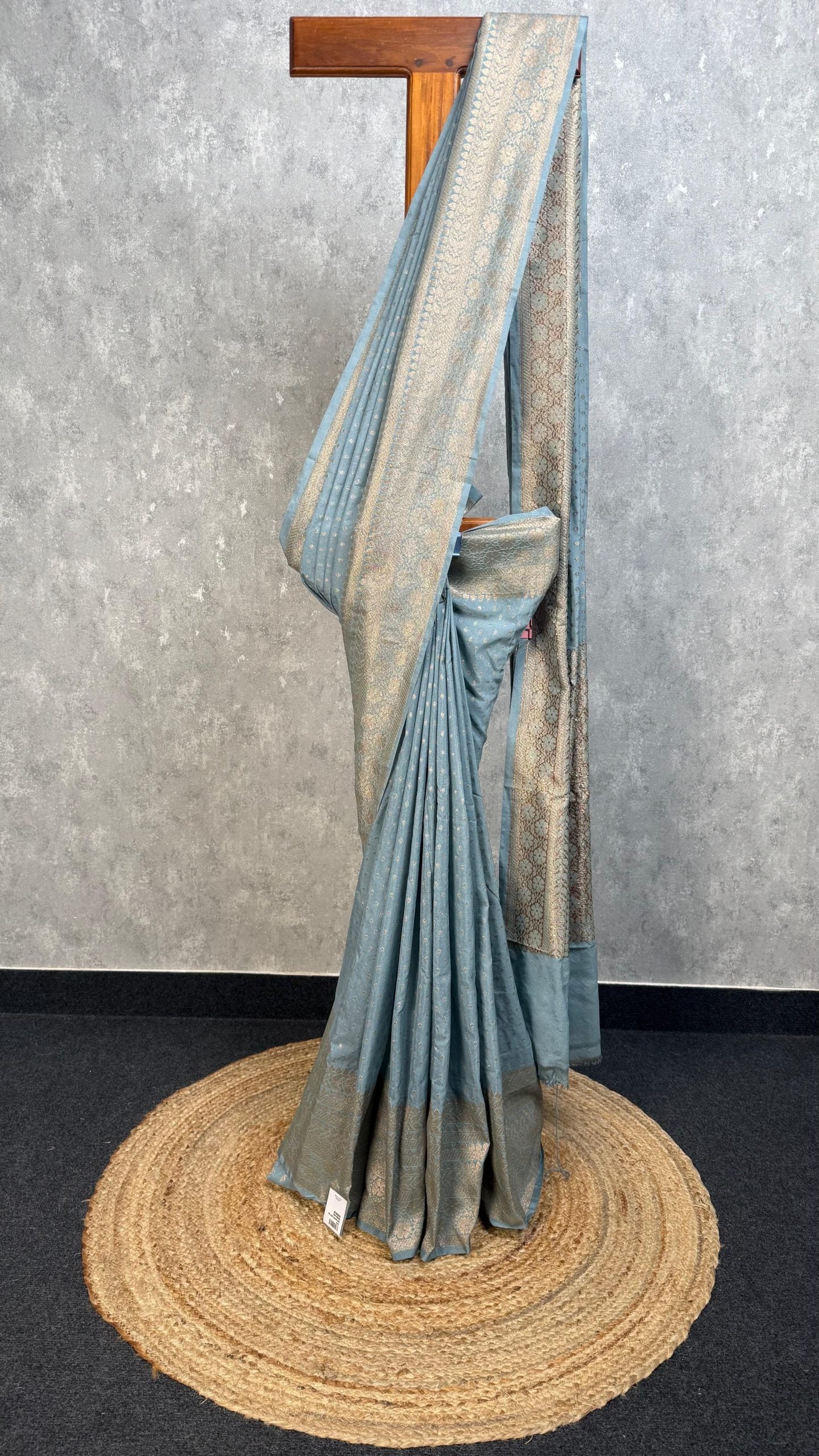 This semi georgette antique zari Banarasi saree features a beautiful sky blue colour with intricate gold zari patterns. The saree showcases a blend of traditional Banarasi craftsmanship with antique zari work. It has a subtle sheen typical of semi georgette fabric. The saree is adorned with elegant gold patterns adding to its classic appeal. The saree comes with attached self color blouse piece.