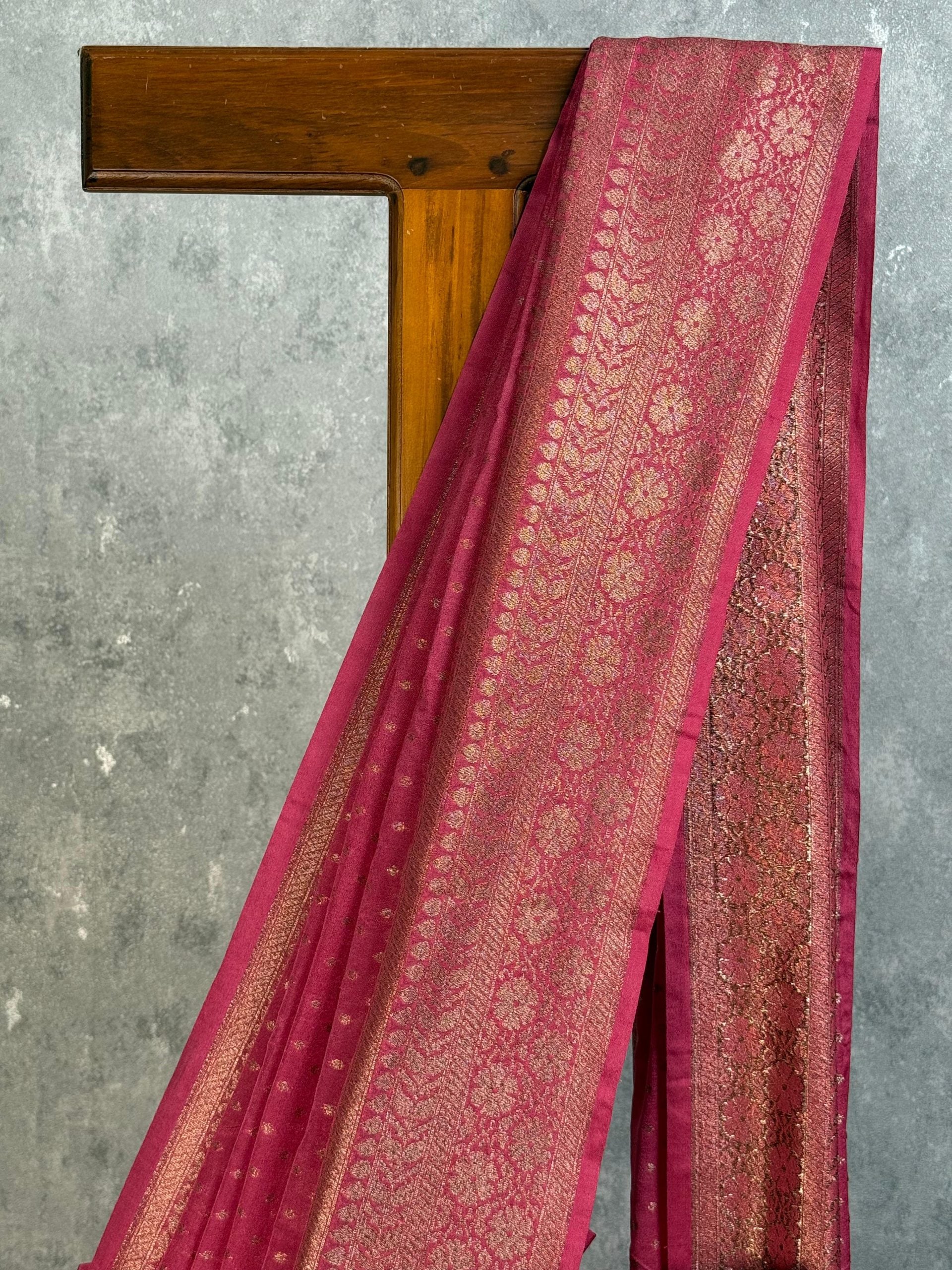 This semi georgette antique zari Banarasi saree features a beautiful rani pink colour with intricate gold zari patterns. The saree showcases a blend of traditional Banarasi craftsmanship with antique zari work. It has a subtle sheen typical of semi georgette fabric. The saree is adorned with elegant gold patterns adding to its classic appeal. The saree comes with attached self color blouse piece.
