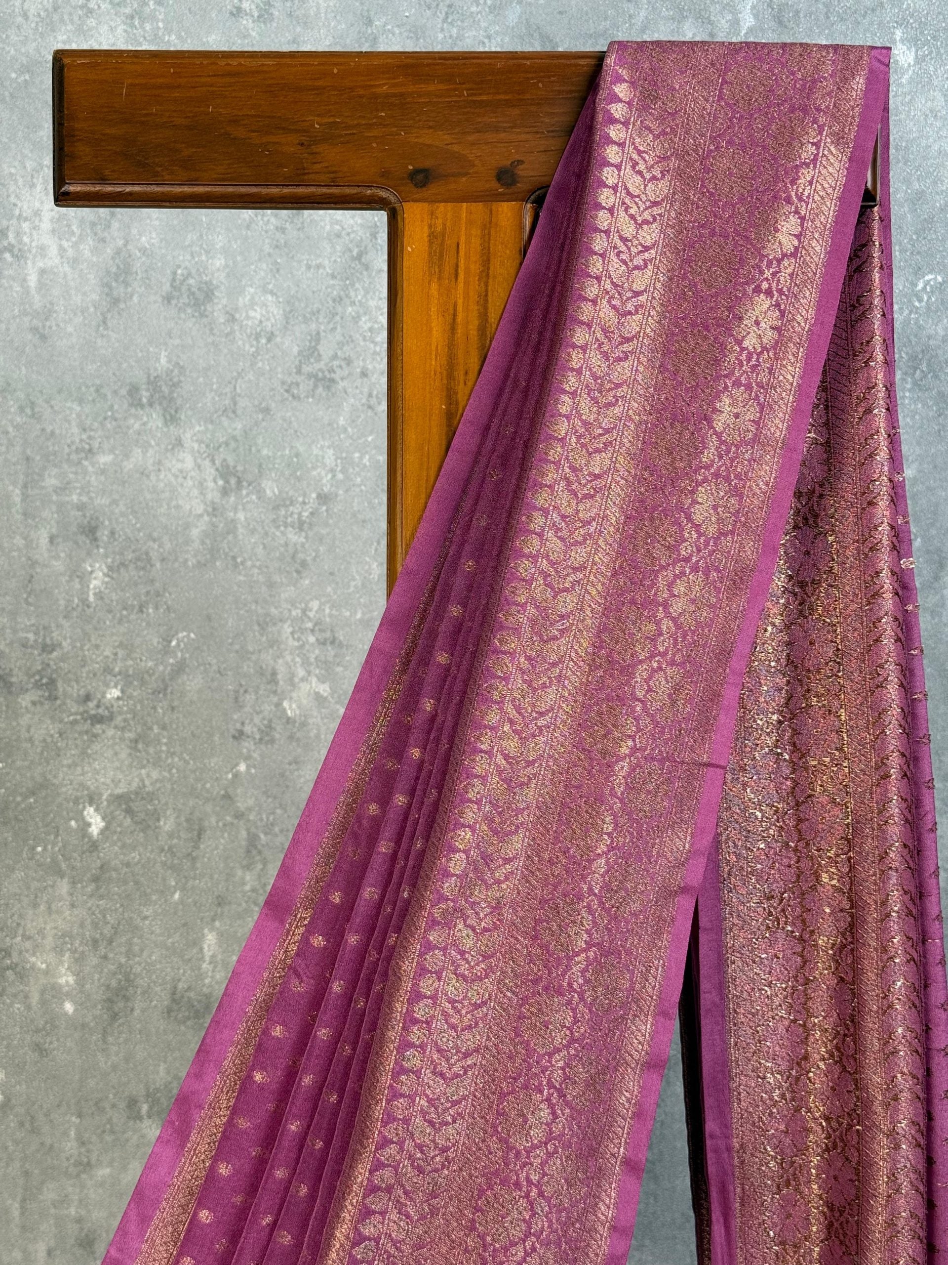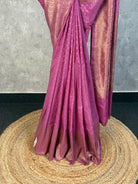 This semi georgette antique zari Banarasi saree features a beautiful pink colour with intricate gold zari patterns. The saree showcases a blend of traditional Banarasi craftsmanship with antique zari work. It has a subtle sheen typical of semi georgette fabric. The saree is adorned with elegant gold patterns adding to its classic appeal. The saree comes with attached self color blouse piece.