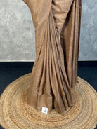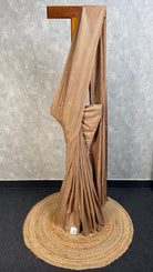 This semi georgette antique zari Banarasi saree features a beautiful dark beige colour with intricate gold zari patterns. The saree showcases a blend of traditional Banarasi craftsmanship with antique zari work. It has a subtle sheen typical of semi georgette fabric. The saree is adorned with elegant gold patterns adding to its classic appeal. The saree comes with attached self color blouse piece.