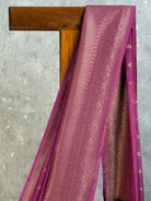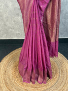 This semi georgette antique zari Banarasi saree features a beautiful magenta colour with intricate gold zari patterns. The saree showcases a blend of traditional Banarasi craftsmanship with antique zari work. It has a subtle sheen typical of semi georgette fabric. The saree is adorned with elegant gold patterns adding to its classic appeal. The saree comes with attached self color blouse piece.