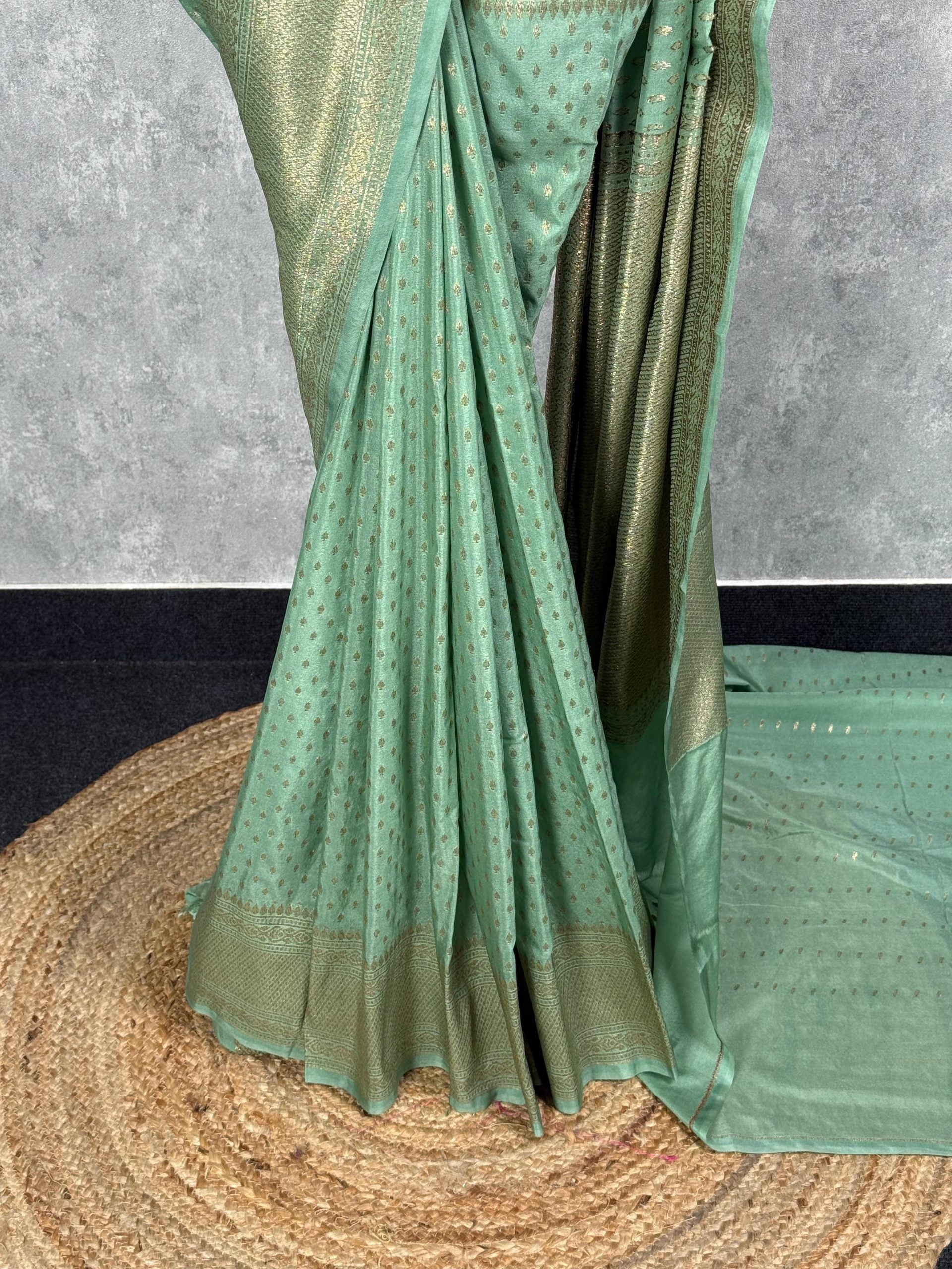 This semi georgette antique zari Banarasi saree features a rich green colour with intricate gold zari patterns. The saree has a subtle sheen and is adorned with delicate zari work throughout. The antique zari adds a touch of traditional elegance to the saree. The saree showcases classic Banarasi craftsmanship with its zari patterns and design. The saree comes with attached self color blouse piece.