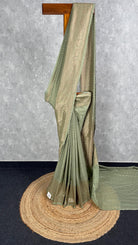 This semi georgette antique zari Banarasi saree features a rich green colour with intricate gold zari patterns. The saree has a subtle sheen and is adorned with delicate zari work throughout. The antique zari adds a touch of traditional elegance to the saree. The saree showcases classic Banarasi craftsmanship with its zari patterns and design. The saree comes with attached self color blouse piece.