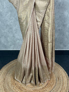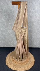 This semi georgette antique zari Banarasi saree features a rich beige colour with intricate gold zari patterns. The saree has a subtle sheen and is adorned with delicate zari work throughout. The antique zari adds a touch of traditional elegance to the saree. The saree showcases classic Banarasi craftsmanship with its zari patterns and design. The saree comes with attached self color blouse piece.
