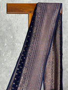 This stunning Semi Georgette Antique Zari Banarasi Saree comes in a vibrant royal blue shade, admired with intricate antique gold zari weavings. The saree comes with attached self color blouse piece.