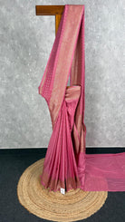 This stunning Semi Georgette Antique Zari Banarasi Saree comes in a vibrant pink shade, admired with intricate antique gold zari weavings. The saree comes with attached self color blouse piece.