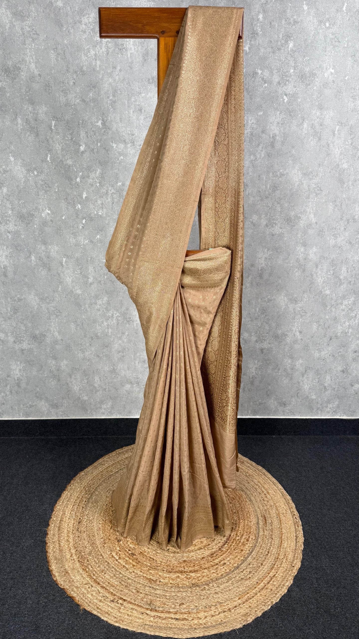 This stunning Semi Georgette Antique Zari Banarasi Saree comes in a vibrant beige shade, admired with intricate antique gold zari weavings. The saree comes with attached self color blouse piece.
