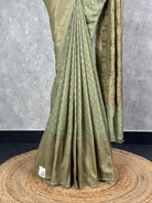 This stunning Semi Georgette Antique Zari Banarasi Saree comes in a vibrant green shade, admired with intricate antique gold zari weavings. The saree comes with attached self color blouse piece.