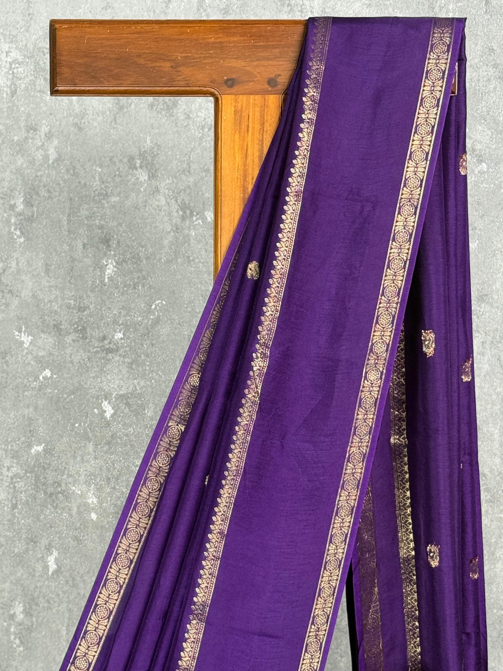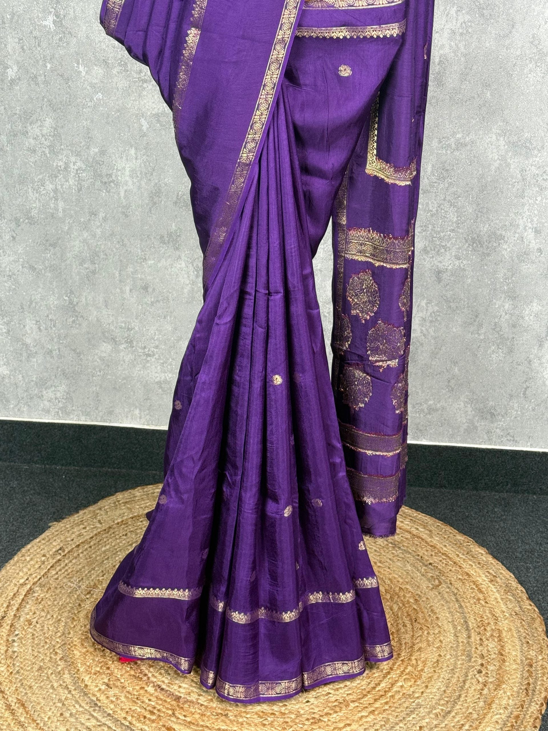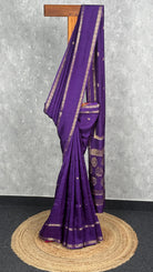 This saree exudes regal charm with its rich royal purple hue adorned by intricate golden zari work. The traditional motifs and detailed borders add a luxurious elegance, making it ideal for festive celebrations and grand occasions. Its vibrant color and classic design create a striking, timeless look.